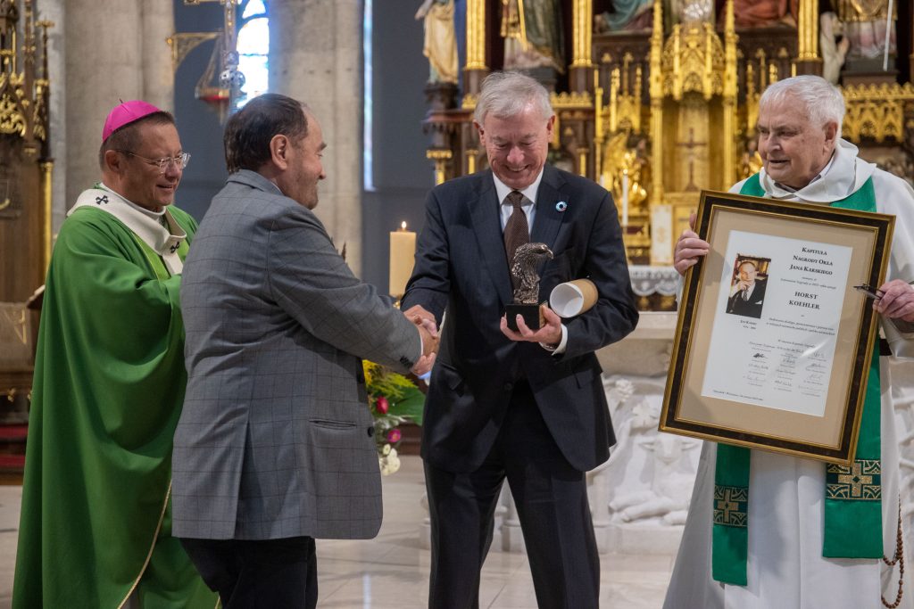 – Trzeba przypomnieć, że w roku 2005 Prezydent Koelher został uhonorowany „w uznaniu znamienitych zasług dla rozwoju polsko-niemieckiej współpracy” najwyższym polskim odznaczeniem państwowym – Orderem Orła Białego. Dzisiaj honorujemy pana prezydenta Koelehra orderem „Orła Karskiego”. Czyniąc to , pragniemy jeszcze raz podziękować za jego wysiłki w dziele jednania naszych narodów, a zarazem zawołać, że dzieło normowania stosunków polsko -niemieckich wymaga kontynuacji i to kontynuacji rzetelnej, uczciwej – z poszanowaniem prawdy i sprawiedliwości. Obecny czas znowu domaga się dobrze przemyślanego, autentycznego dialogu między naszymi narodami. Kapituła nagrody pragnie, aby to była cegiełka w dziele umacniania normalnych stosunków między naszymi narodami. Orzeł Jana Karskiego kierując swój lot ku Horstowi Koehlerowi czyni to w dobrym kierunku – zauważył o. Wiśniewski.