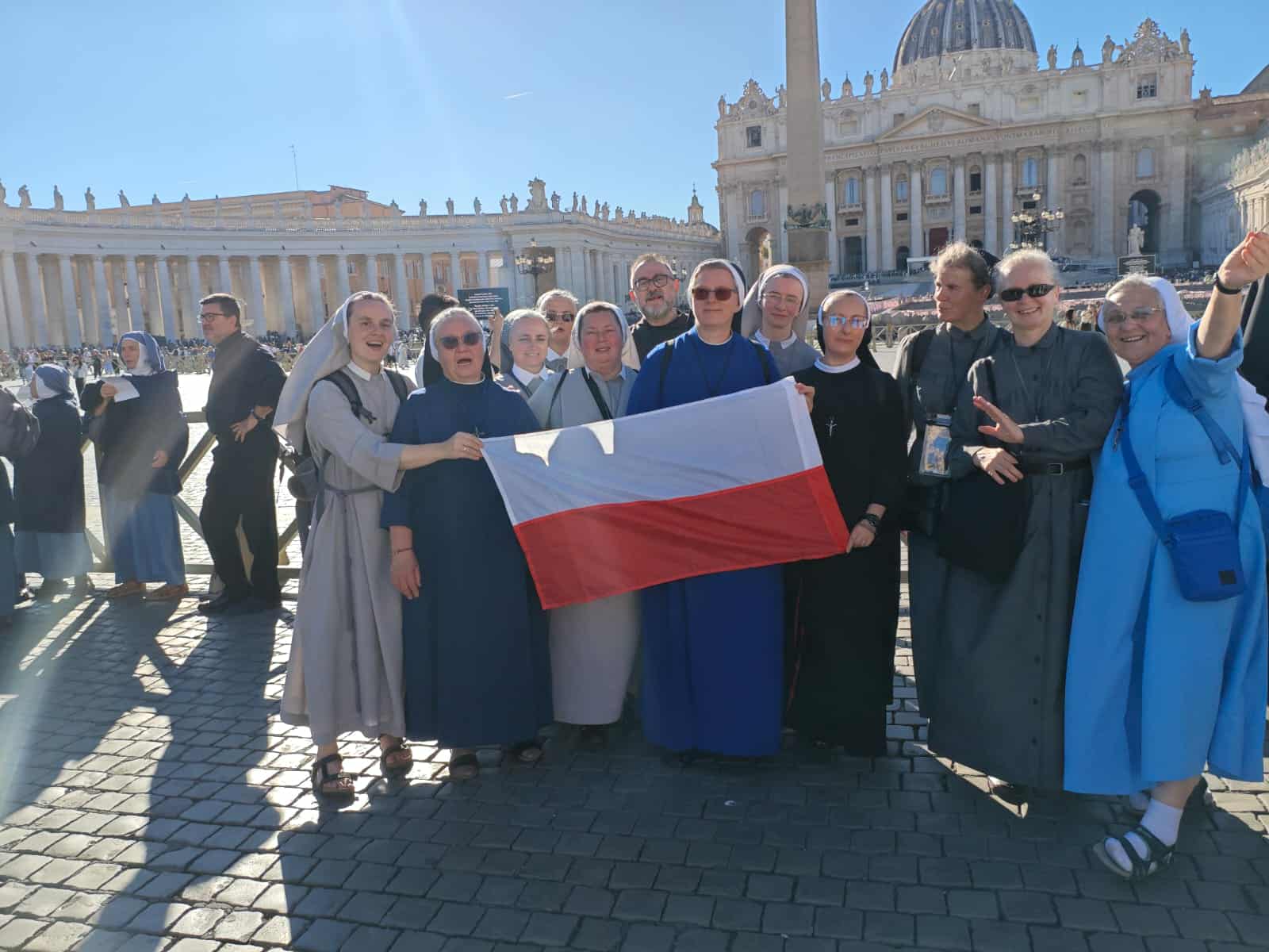Papież zwracając się do zgromadzonych Polaków powiedział między innymi – Serdecznie pozdrawiam Polaków, a szczególnie osoby życia konsekrowanego z okazji ich Jubileuszu. Przybyliście tutaj przynosząc swoją codzienność naznaczoną nadziejami, planami, ale także niepewnością jutra. Zmartwychwstały Chrystus zaprasza was do przeżywania każdego dnia w świetle wiary. Spróbujcie spojrzeć Jego oczami na prawdziwy sens swojej historii i powołania. Zawierzam was Matce Bożej Różańcowej i z serca błogosławię! – mówił Ojciec Święty.