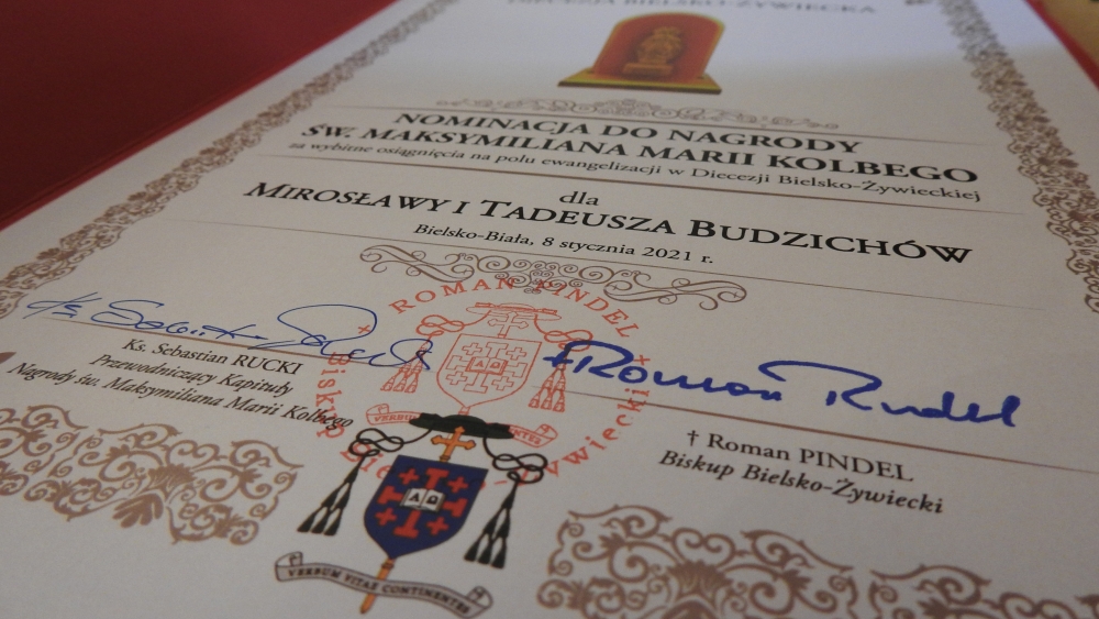 Fot. diecezja.bielsko.plTadeusz i Mirosława Budzichowie – małżeństwo katechistów wędrownych, którzy od 30 lat związani są z Drogą Neokatechumenalną – zostali laureatami „Nagrody św. Maksymiliana Marii Kolbego” w diecezji bielsko-żywieckiej. Po raz piąty biskup Roman Pindel wręczył kopię figurki „Matki Bożej zza drutów” z Centrum św. Maksymiliana w Harmężach, będącą nagrodą za działalność ewangelizacyjną i apostolską. Z powodu pandemii gala wręczenia nagrody odbyła się w formie wirtualnej – w postaci wydarzenia zaaranżowanego 10 stycznia br. w mediach społecznościowych.
