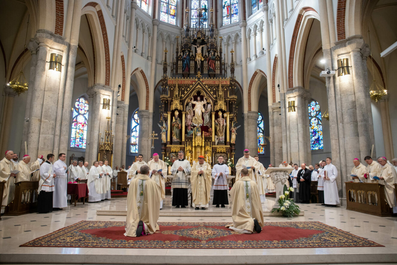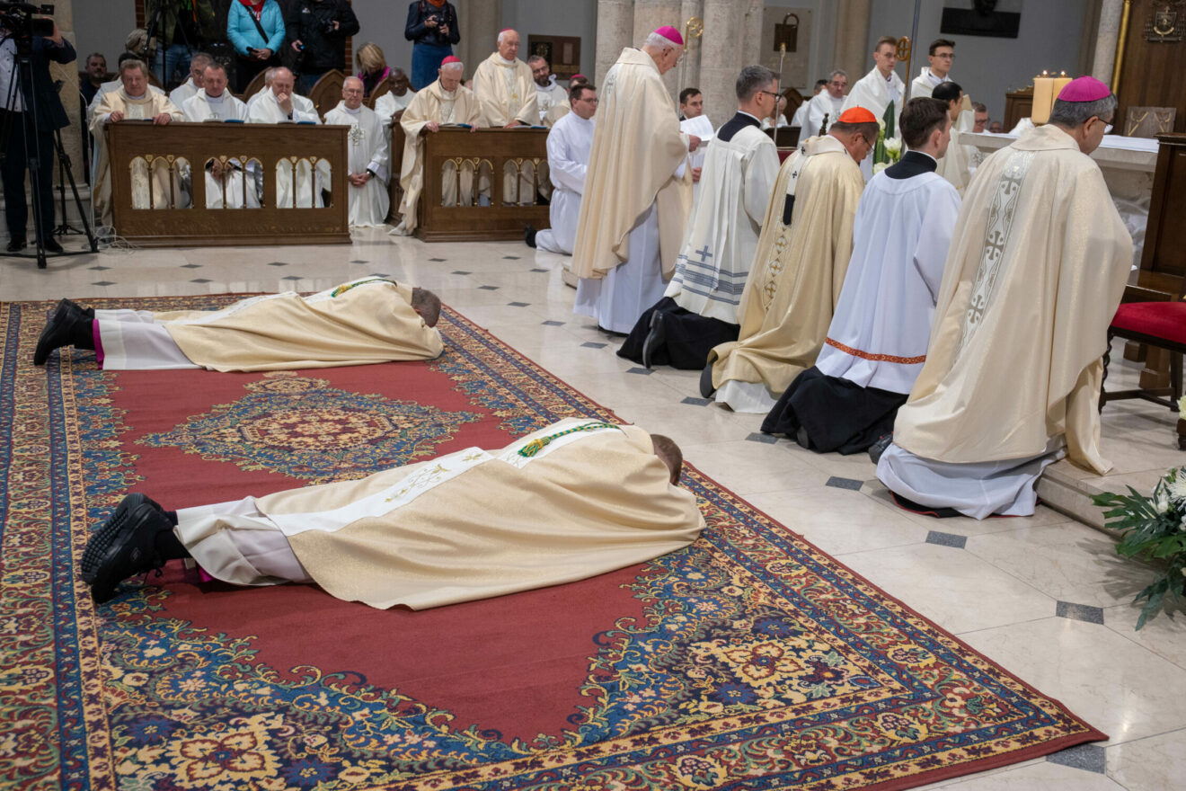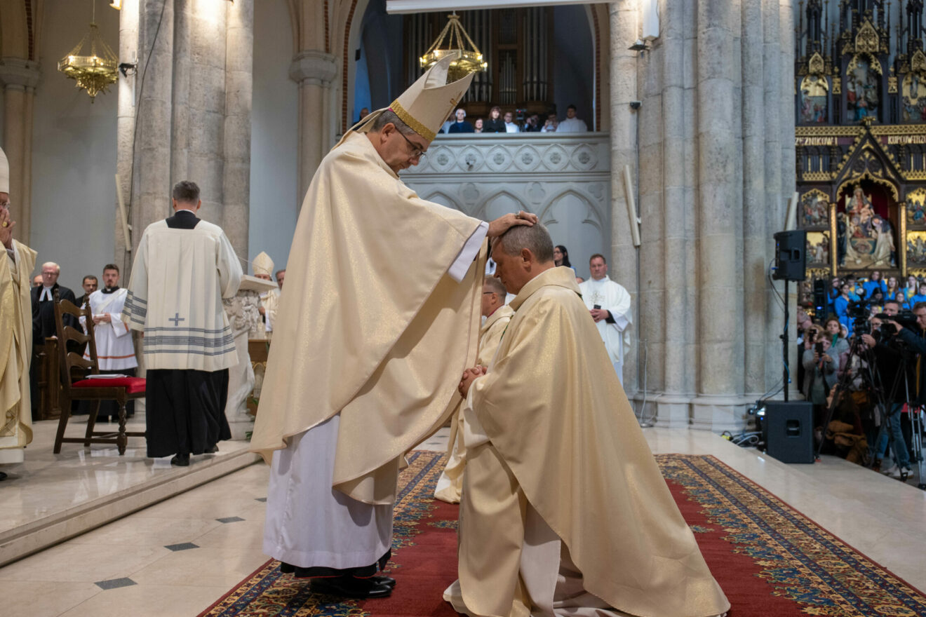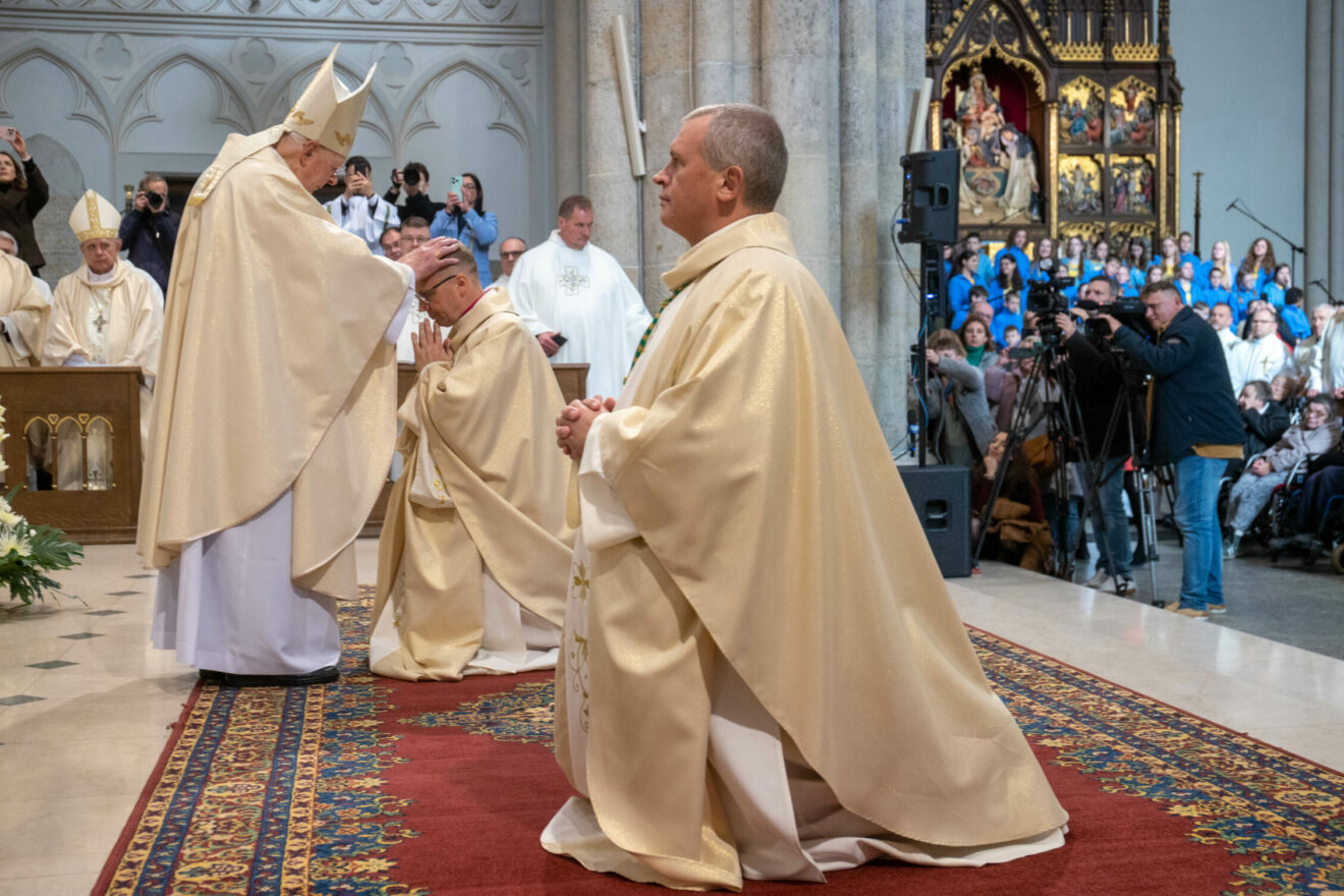 Po homilii rozpoczął się właściwy obrzęd święceń biskupich. Na początku biskupi nominaci złożyli przyrzeczenia, po których położyli się krzyżem i została odśpiewana litania do Wszystkich Świętych. Następnie w ciszy nastąpił obrzęd nałożenia rąk przez konsekratora, współkonsekratorów oraz pozostałych biskupów, po czym kard. Ryś otworzył księgi Pisma Świętego nad głowami kandydatów do święceń i odmówił modlitwę konsekracyjną. Kolejnym elementem święceń biskupich było namaszczeni głów wybranych i przekazanie im księgi Ewangelii oraz insygniów biskupich: pierścienia, mitry i pastorału.