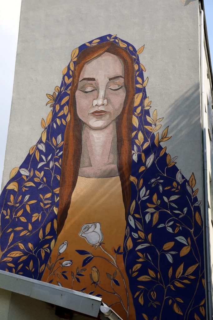 Mural przedstawia kobietę z zamkniętymi oczami, która trzyma różę, a ubrana jest w złoto–niebieską szatę. – obecność Maryi nie narzuca się. Ma Ona zamknięte oczy, nie patrzy by oceniać. Ona chce być z ludźmi. W symbolice i kolorystyce jest to nawiązanie do Maryi, ale nie jest to kopia jakiegoś konkretnego przedstawienia, nie ma jakiś jednoznacznych symboli, które mogłyby jakimś osobom przeszkadzać. Jest to przedstawienie kobiety ubranej w niebo, stąd kolor szaty Maryi – zaznacza autorka.