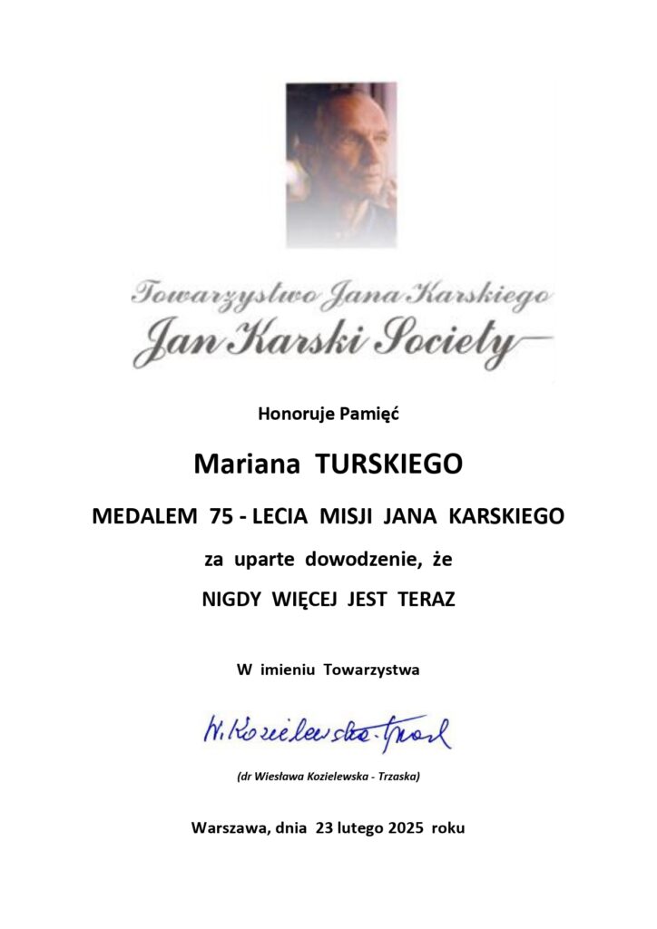 Dlatego też, uważamy, że Marian Turski podążał śladami Jana Karskiego i jego misji. Medal tej misji sprawiedliwie Mu się należy. Niech motywacja towarzysząca wyróżnieniu: „za uparte dowodzenie, że NIGDY WIĘCEJ JEST TERAZ” będzie ostatnim aktem pożegnania z Marianem w jego ziemskiej drodze. Wierzymy, że jest już z Janem Karskim, swoim Przyjacielem.
