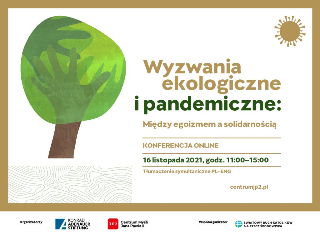 Centrum Myśli Jana Pawła II oraz Fundacja Konrada Adenauera przedstawicielstwo w Polsce we współpracy ze Światowym Ruchem Katolików na rzecz Środowiska zapraszają na międzynarodową konferencję „Wyzwania ekologiczne i pandemiczne: między egoizmem a solidarnością”. Wydarzenie odbędzie online 16 listopada o godzinie 11.00. Do udziału zaproszeni zostali wybitni eksperci, którzy dzięki swojemu autorytetowi naukowemu wpływają na kierunek dyskursu dotyczącego reform społecznych i politycznych w Europie, a równocześnie proponują konkretne rozwiązania związane ze zwiększaniem indywidualnej i wspólnotowej odpowiedzialności.