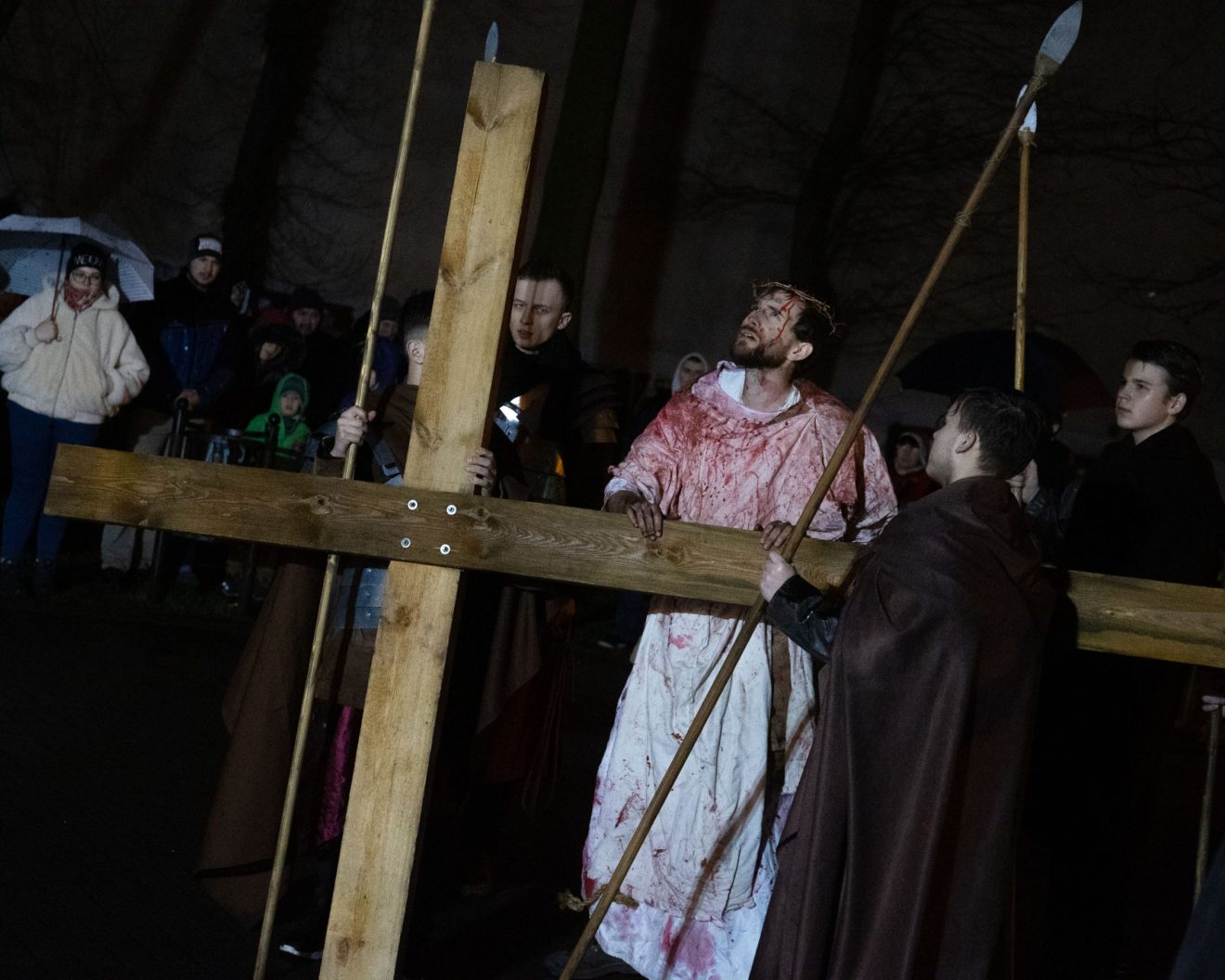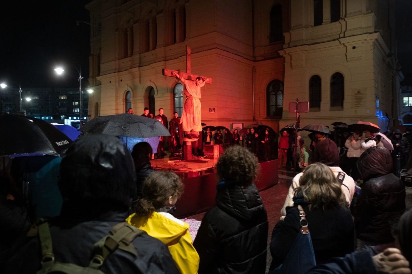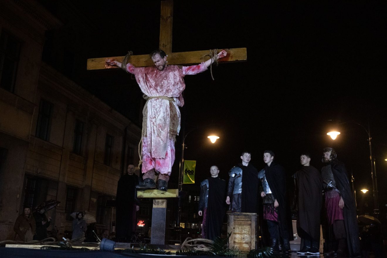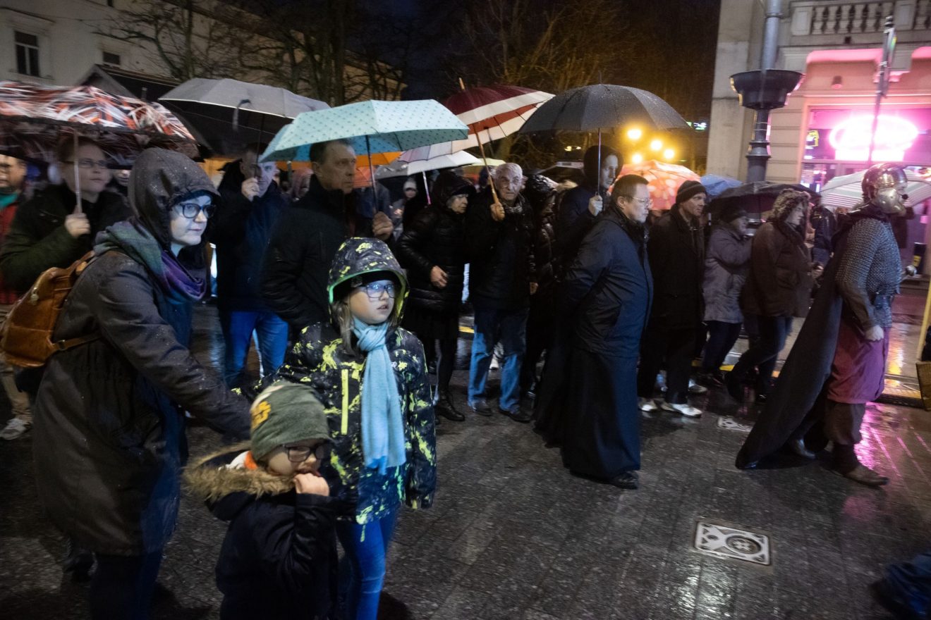 Fot. ks. Paweł KłysJuż po raz kolejny – mimo niesprzyjającej pogody – ulicami Łodzi przeszło Misterium Męki Pańskiej „Dla rozbitych”. Inscenizacja ostatnich chwil życia i śmierci Jezusa rozpoczęła się w piątkowy wieczór w Pasażu Rubinsteina.