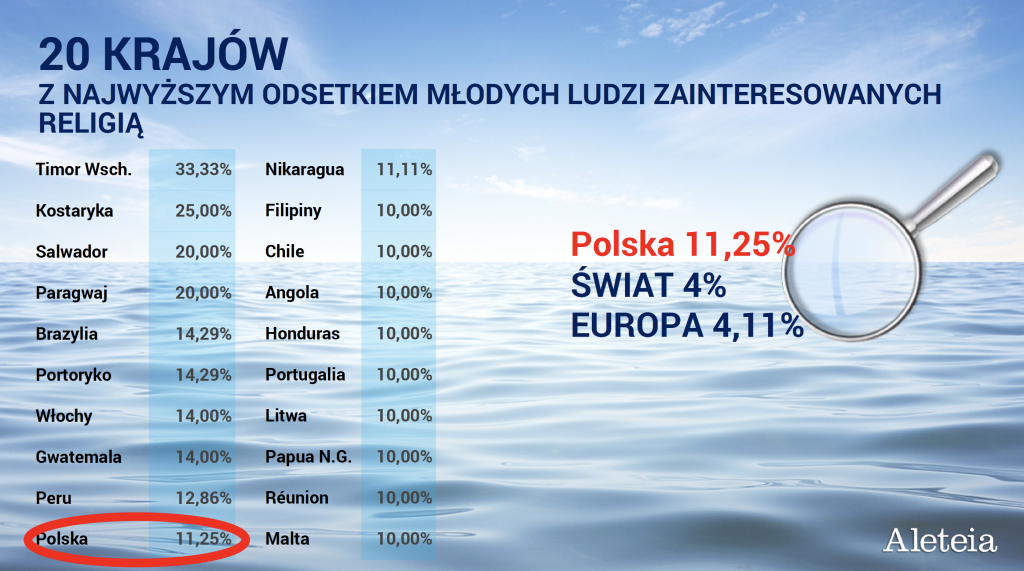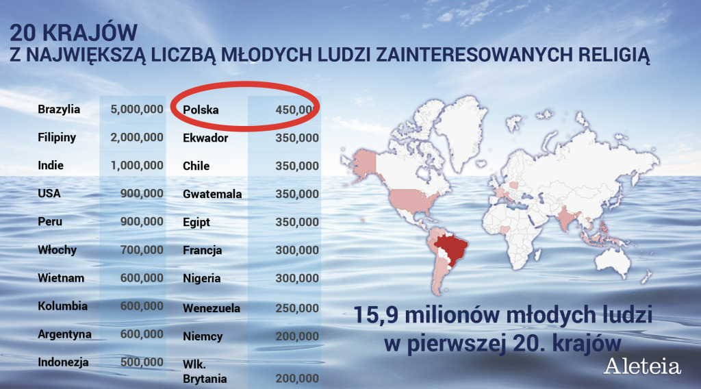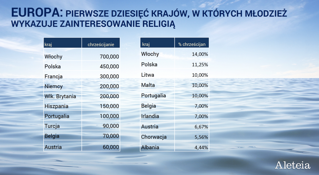 Wyodrębniono również 20 krajów z największym odsetkiem młodych zainteresowanych religią. Połowa krajów na tej liście to państwa Ameryki Łacińskiej, choć dziwi brak młodzieży meksykańskiej. Wśród krajów europejskich wymienić można kolejno: Włochy, Polskę, Portugalię, Litwę i Maltę. Na Starym Kontynencie odsetek zainteresowanych wiarą jest niemal taki sam, jak gdzie indziej: wynosi około 4,11 proc. To oznacza, że 2,7 mln młodych Europejczyków aktywnie podejmuje w mediach społecznościowych tematy religijne.