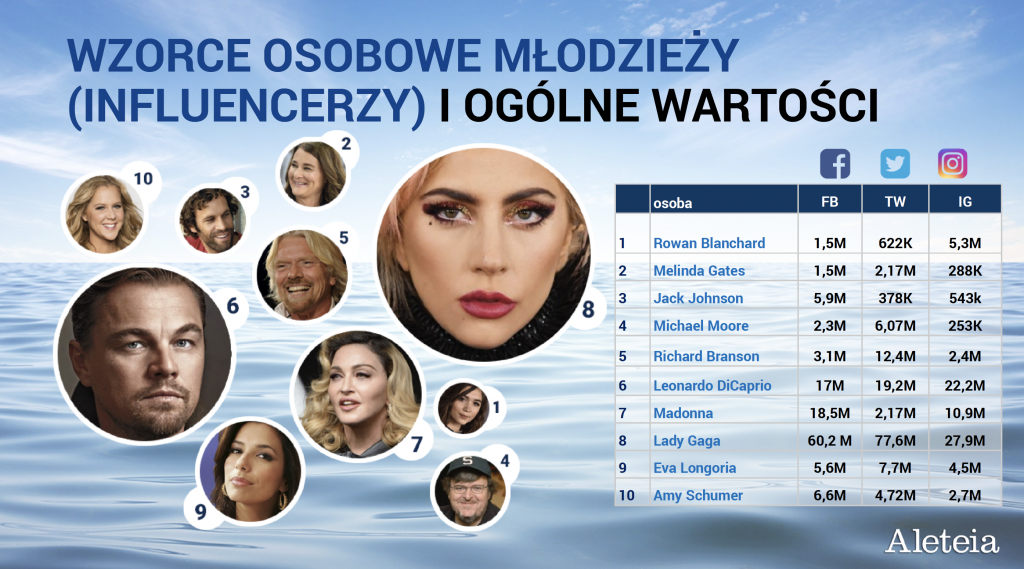 Zasadniczo jednak influencerami dla młodych są postaci ze świata rozrywki. To, że Katy Perry ma 109 mln śledzących ją na Twitterze, zaś Justin Bieber – 106 mln (dwukrotnie więcej, aniżeli papież), dowodzi, niewiarygodnego wręcz wpływu na młodzież ludzi z tej branży. Ogromna jest też rzesza młodych śledzących mistrzów sportu. Autorzy badania stawiają wręcz sobie pytanie, czy dla wielu młodych sport nie stał się druga religią.