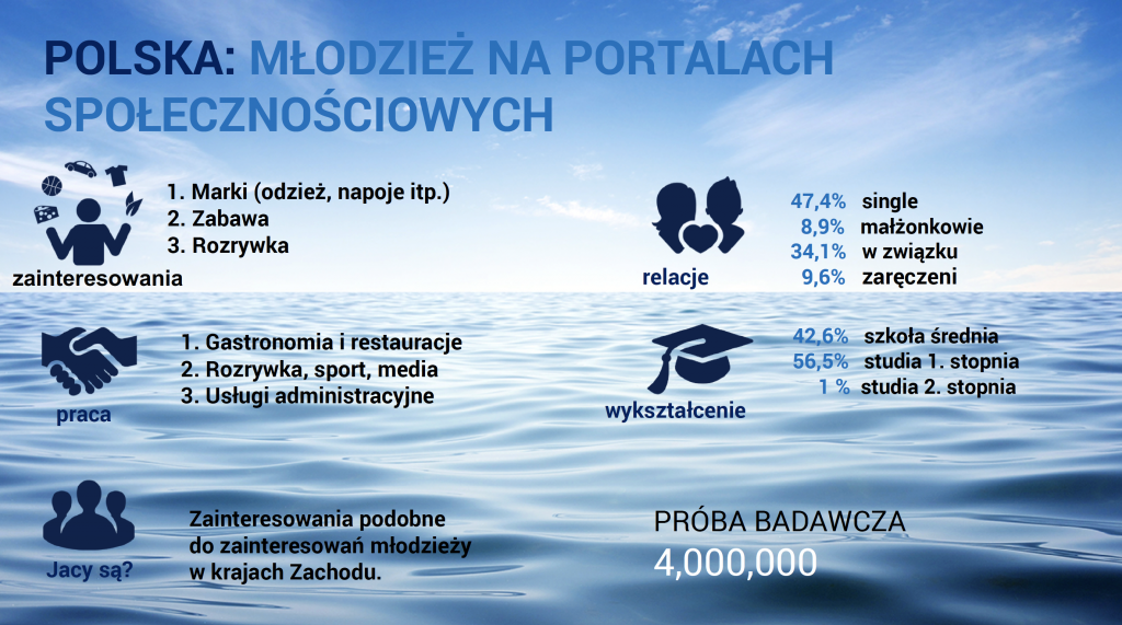 Z badania wynika, że generalnie młodzi ludzie poszukują w mediach społecznościowych rozrywki ( gry wideo, media, seriale TV, muzyka, sport itp.), informacji o markach produktów, co wynika z pragnienia zdobycia uznania w oczach innych i potrzeby dzielenia zainteresowań z rówieśnikami. Ich ulubionym językiem jest język zabawy i humoru.