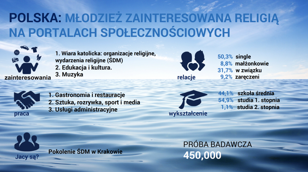 Jedną z analizowanych w ramach badania grup byli młodzi Polacy – 4 mln. osób. Zainteresowania ich nie odbiegają od zainteresowań rówieśników z Zachodu. To marki (odzież, napoje itp.), humor i rozrywka, np. gry. Ok. 11 proc. (450 tys. osób) udostępnia treści związane z wiarą. Są to w większości ludzie bardzo zaangażowani religijnie.