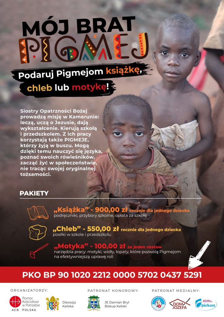 Diecezja kaliska i Papieskie Stowarzyszenie Pomoc Kościołowi w Potrzebie chcą zapewnić edukację większej liczbie dzieci. Poprzez kampanię „Mój brat Pigmej” do najmłodszych dotrą podręczniki i przybory szkolne. Środki, jakie uda się zebrać, trafią też na posiłki dla uczniów w szkole i przedszkolu oraz narzędzia do pracy. „Pigmeje chodzą pomagać innym w polu, żeby zarobić na swoje utrzymanie, na jedzenie. Mają też okres polowań. Nie ma ich wtedy nawet w szkole. W lesie są przez miesiąc, dwa. Polują i robią zapasy” – wyjaśnia siostra Dariusza.