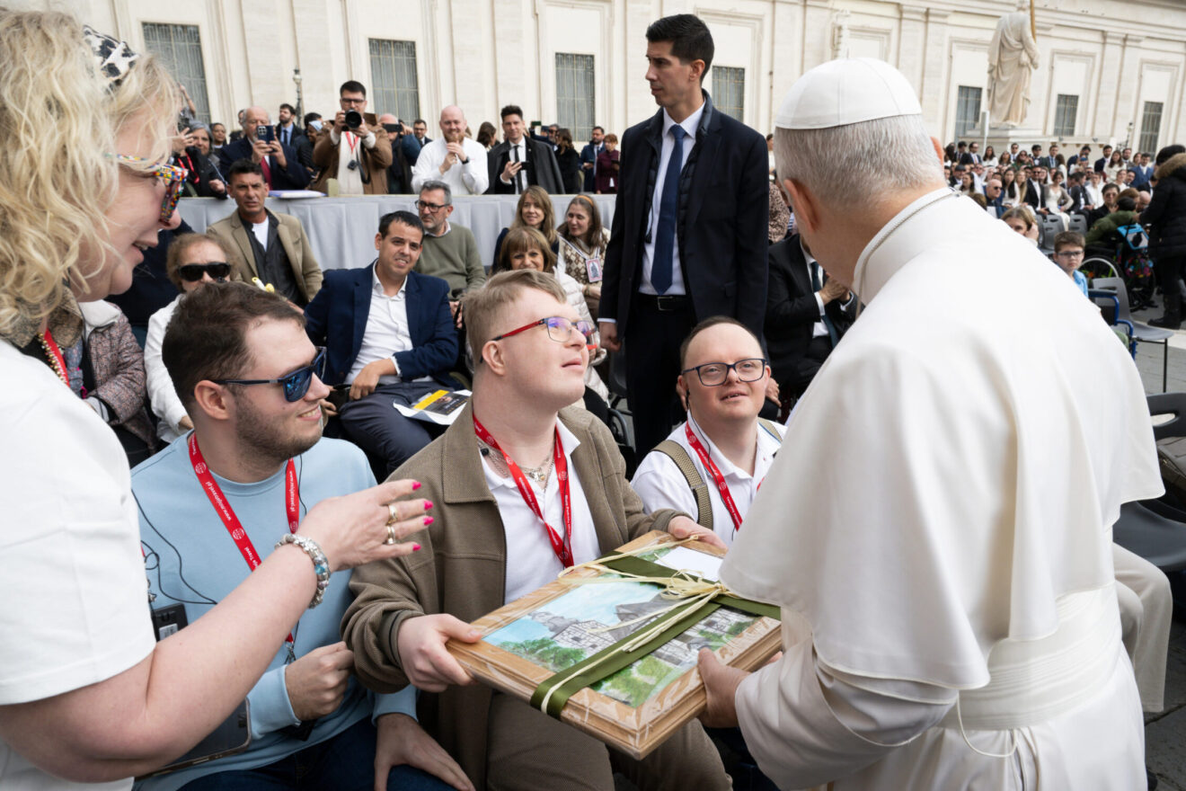 Fot. Vatican MediaGrupa osób z niepełnosprawnościami, ich rodziców i opiekunów oraz pracowników Milickiego Stowarzyszenia Przyjaciół Dzieci i Osób Niepełnosprawnych przybyła do Rzymu na pielgrzymkę, której kulminacyjnym momentem była audiencja generalna Papieża. Podczas spotkania z Ojcem Świętym wręczyli mu wyjątkowy prezent przygotowany przez uczestników warsztatów terapii zajęciowej – obraz ukazujący kościół pw. św. Andrzeja Boboli w Miliczu, gdzie tak naprawdę rozpoczęło się pierwsze wsparcie dla organizacji.