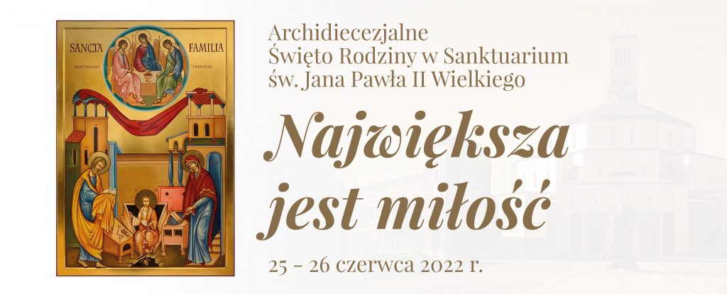 Dziękczynienie za dar małżeństwa i rodziny pod hasłem „Największa jest miłość” rozpocznie się w sobotę 25 czerwca. O 14.00 zaplanowano Bieg Rodzinny. O 16.30 z Sanktuarium Bożego Miłosierdzia na błonia przed Sanktuarium św. Jana Pawła II wyruszy procesja z ikoną Najświętszej Rodziny, której będzie przewodniczył kard. Stanisław Dziwisz. Krakowski metropolita senior będzie o 19.00 przewodniczył Mszy św. z udziałem wspólnot neokatechumenalnych. Wcześniej ikona Rodziny z Nazaretu będzie wniesiona na scenę przed sanktuarium, gdzie odbywać się będą modlitwy w duchowej łączności z Rzymem i Ojcem Świętym Franciszkiem.