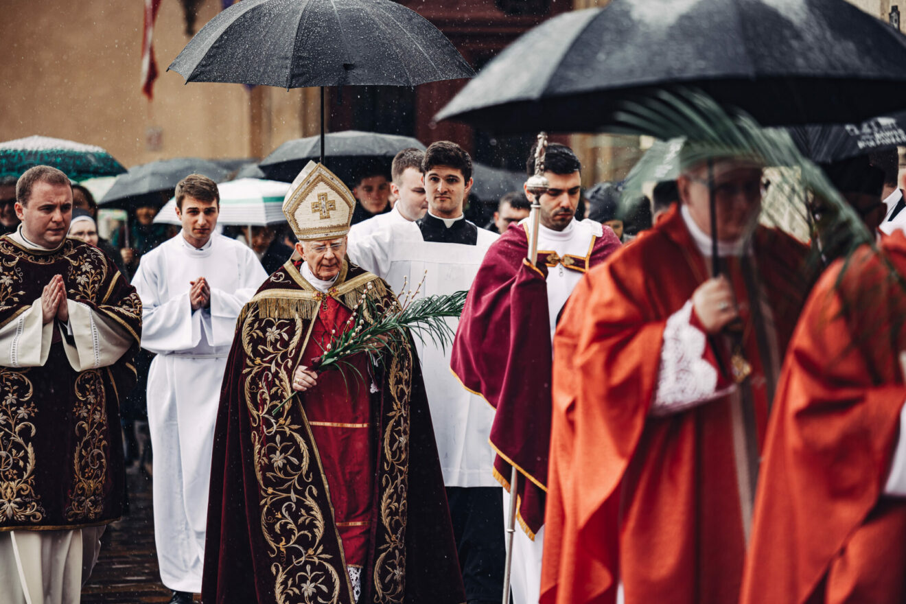 Liturgia Niedzieli Palmowej jest rozpięta między dwoma momentami: radosną procesją z palmami oraz czytaniem- jako Ewangelii – Męki Pańskiej, zwykle z podziałem na role, według jednego z 3 Ewangelistów: Mateusza, Marka lub Łukasza (Mękę Pańską wg św. Jana czyta się podczas liturgii Wielkiego Piątku). W ten sposób Kościół podkreśla, że triumf Chrystusa i Jego Ofiara są ze sobą nierozerwalnie związane.