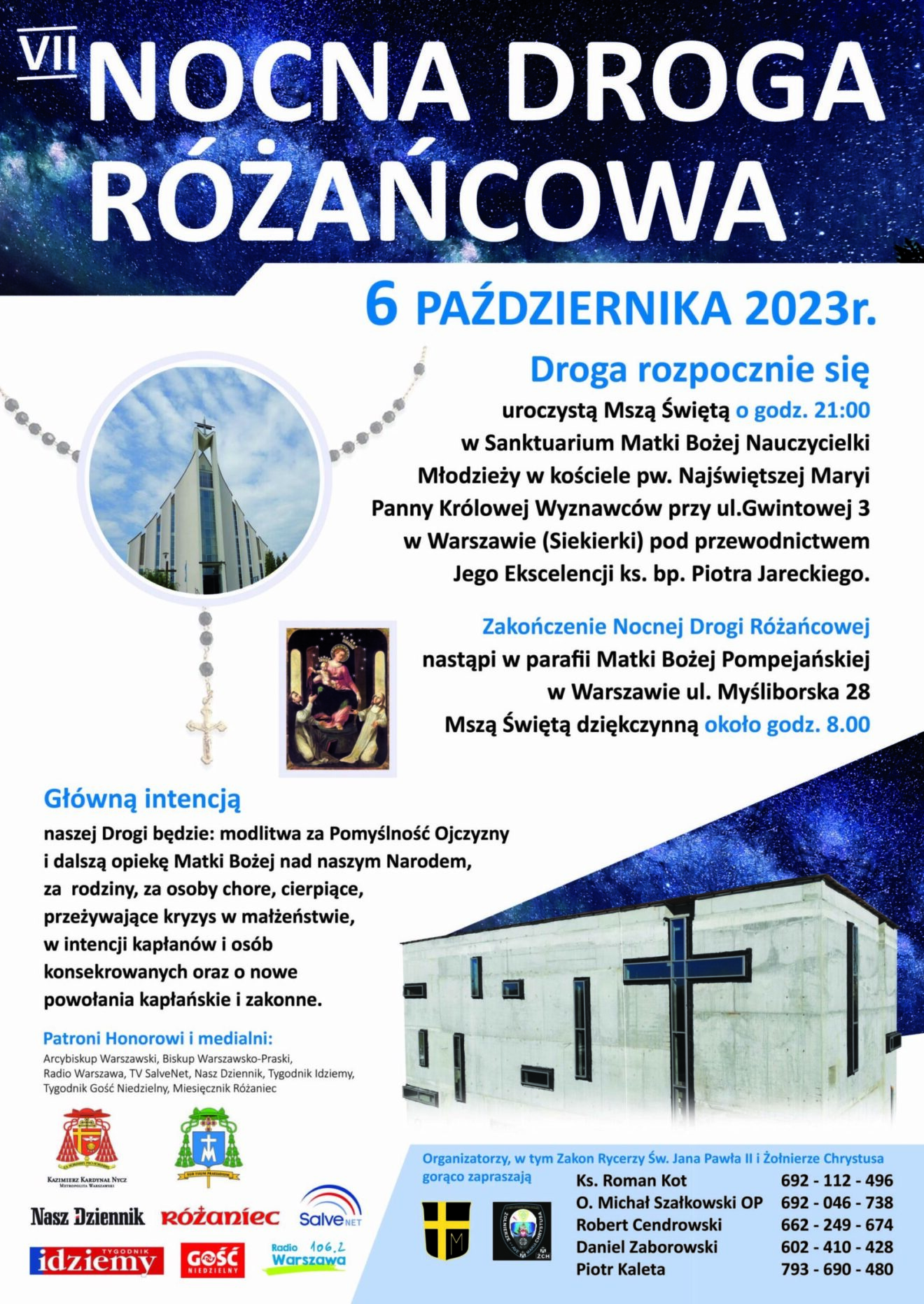 Nocna Droga Różańcowa rozpocznie się Eucharystią sprawowaną 6 października o godz. 21 w sanktuarium Matki Bożej Nauczycielki Młodzieży na warszawskich Siekierkach pod przewodnictwem bp Piotra Jareckiego. Następnie uczestnicy wyruszą w ponad 20- kilometrową wędrówkę ulicami Warszawy, przez Plac Zbawiciela i plac Trzech Krzyży. Przejdą przez Stare i Nowe Miasto a następnie wzdłuż Wisły do ul. Gwiaździstej. Przez Lasek Bielański dojdą do Mostu Marii Curie – Skłodowskiej. Nabożeństwo zakończy się 7 października, w święto Matki Bożej Różańcowej, Msza św. o godz. 8 rano w kaplicy Matki Bożej Pompejańskiej na Żeraniu.