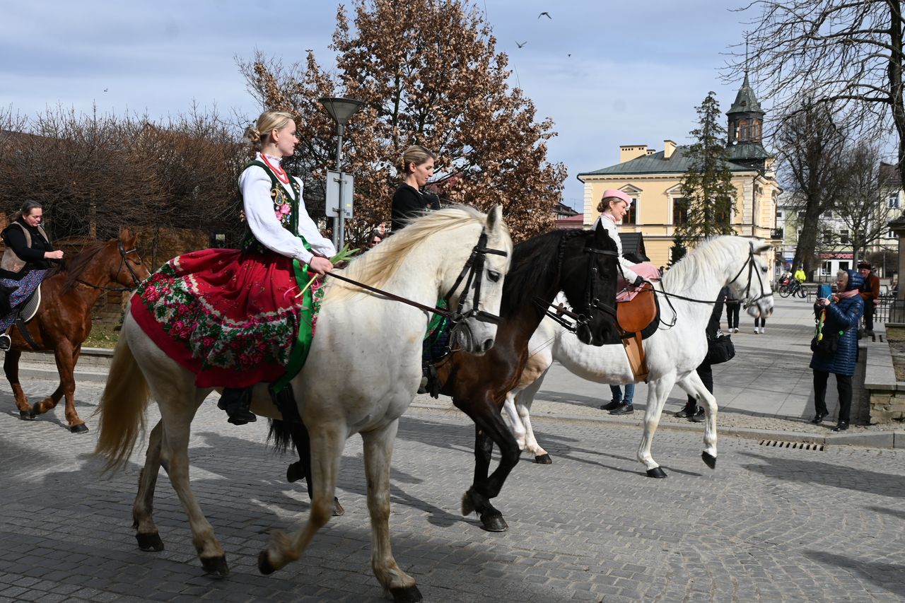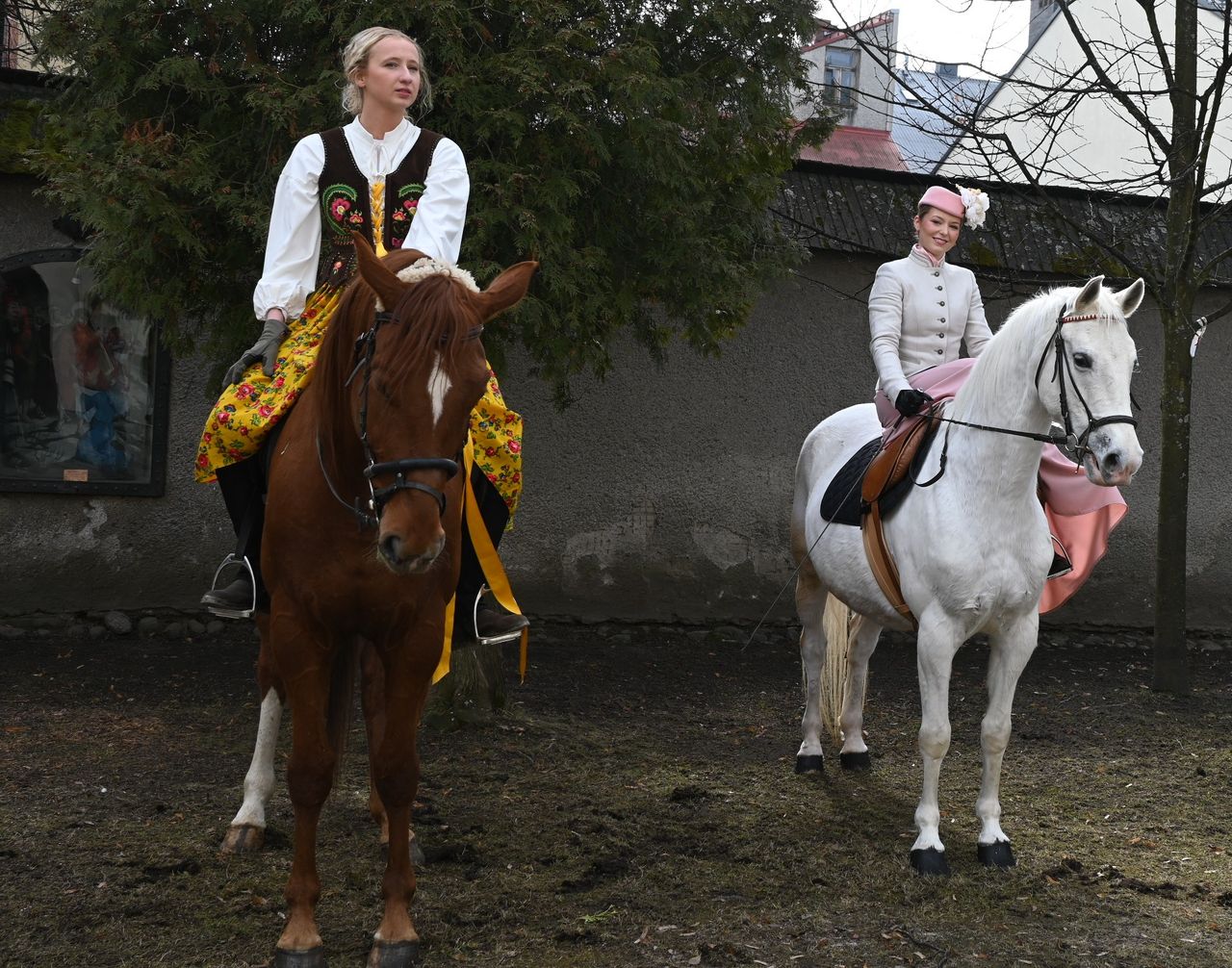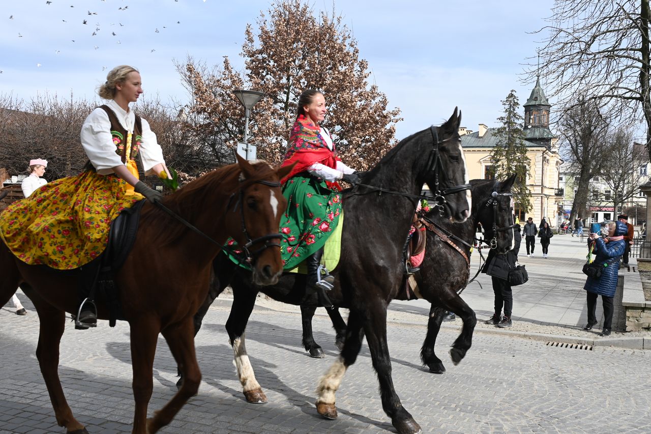 Fot. Jan GłąbińskiW Nowym Targu odbyła się dziś trzecia edycja kobiecej banderii konnej. Panie, w strojach regionalnych, przejechały przez rynek i ulice w centrum miasta, uczestniczyły też w Mszy św. w kościele św. Katarzyny. – Bardzo się cieszę, że jesteście z nami dzisiaj, że razem możemy świętować Dzień Kobiet, a wy realizujecie swoją pasję – mówił ks. Zbigniew Płachta, proboszcz parafii św. Katarzyny w Nowym Targu. Duchowny pobłogosławił też panie i konie.