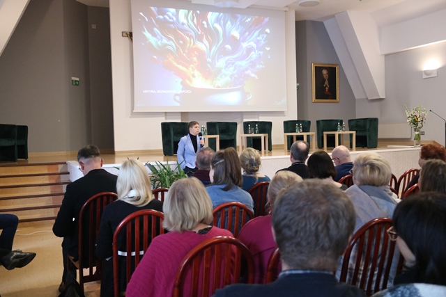 W swojej prelekcji dr hab. Monika Przybysz analizowała wpływ smartfonów na kształtowanie wizerunku i postrzeganie siebie przez młodzież. Omówiła mechanizmy działania neuroprzekaźników, uzależnienia behawioralnego oraz konsekwencje długotrwałego korzystania z ekranów, w tym wpływ niebieskiego światła. Poruszyła zagrożenia w sieci, takie jak bańki informacyjne, fake newsy i hejt oraz ich wpływ na psychikę młodych ludzi. Przedstawiła także praktyki w codziennym korzystaniu z technologii.