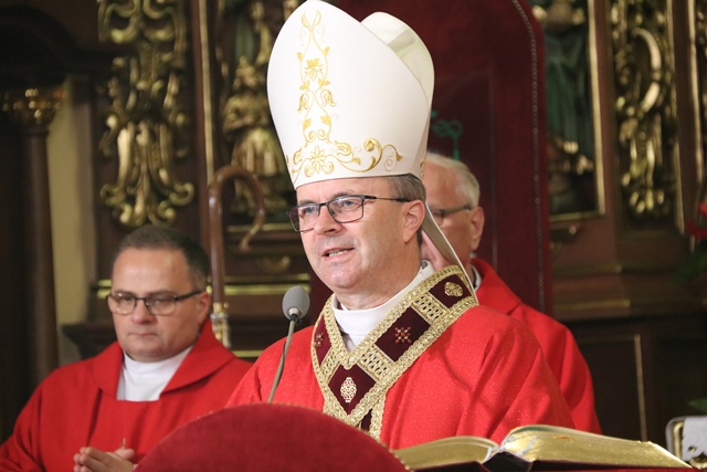 Fot. Ewa Kotowska-Rasiak/KAI– Od bł. biskupa Michała Kozala uczmy się zaangażowania i wierności, ale także wrażliwości na ludzką biedę i potrzeby – mówił biskup kaliski Damian Bryl, który przewodniczył Mszy św. w Bazylice św. Jana Chrzciciela w Krotoszynie w ramach obchodów 130. rocznicy urodzin i 80. rocznicy śmierci bł. bpa Michała Kozala.