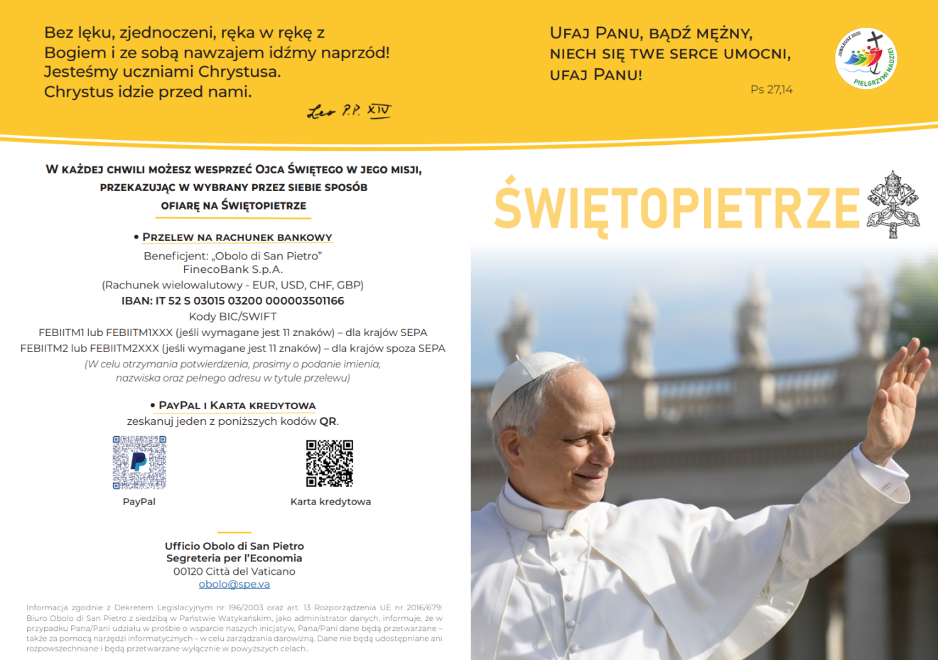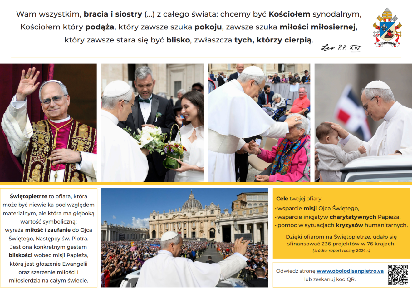 Pomagać papieżowi czynić dobro. Towarzyszyć mu w głoszeniu chrześcijańskiego przesłania, wspierać jego działalność charytatywną wobec tych, którzy żyją w warunkach niegodnych, pomagać mu promować pokój. W tym właśnie tkwi sens świętopietrza – wielowiekowej praktyki solidarności na rzecz papieży, która ma swoje korzenie w Ewangelii. Tradycyjny dzień zbiórki przypada 29 czerwca, w dniu, kiedy Kościół wspomina w liturgii świętych Piotra i Pawła. Zbiórka ta jest konkretnym sposobem wsparcia Papieża Leona XIV w jego misji służby Kościołowi powszechnemu.