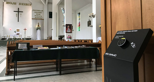 Zainstalowane w gdańskiej parafii urządzenie firmy Nayax, obsługiwane przez Elavon, wygląda jak hokejowy krążek. Jest niewielkie, bo ma ok. 12 cm szerokości. Składający ofiarę ma do wyboru jedną z czterech kwot. Po jej wybraniu wystarczy, że zbliży kartę (lub telefon czy zegarek) i po maksymalnie dwóch sekundach pojawia się komunikat z podziękowaniem: „Bóg zapłać”. Nie wpisuje się PIN-u, ani nie wkłada się karty do urządzenia. „Cała operacja jest bardzo prosta i bezpieczna” – podkreśla proboszcz parafii.