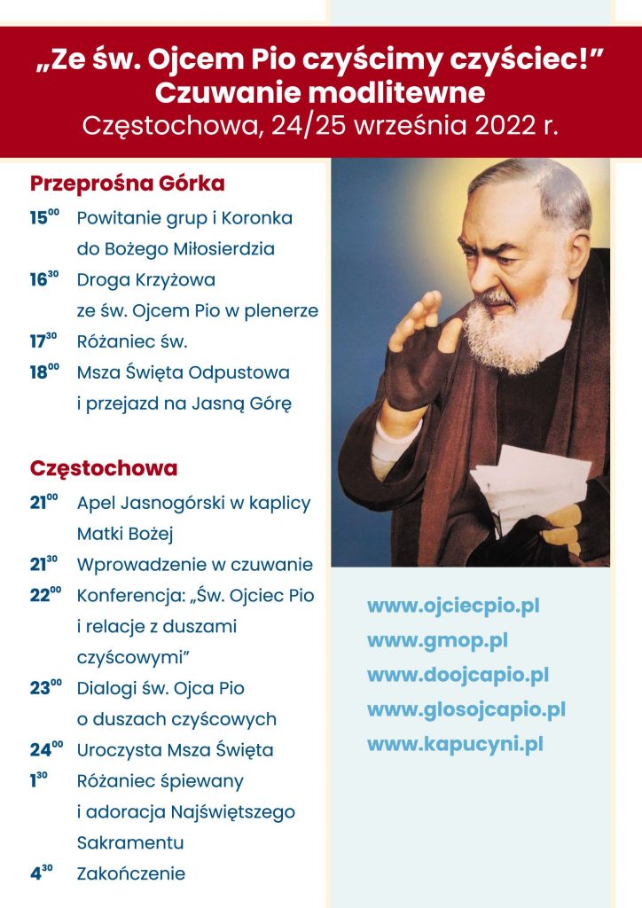 Najbliższe, jesiennie spotkanie, zaplanowano w dniach 24-25 września pod hasłem „Ze św. Ojcem Pio czyścimy czyściec!”. W programie m.in. Apel Jasnogórski w kaplicy Matki Bożej, konferencja „Św. Ojciec Pio i relacje z duszami czyśćcowymi”, dialogi św. Ojca Pio o duszach czyśćcowych, Msza święta o północy oraz różaniec i adoracja Najświętszego Sakramentu.