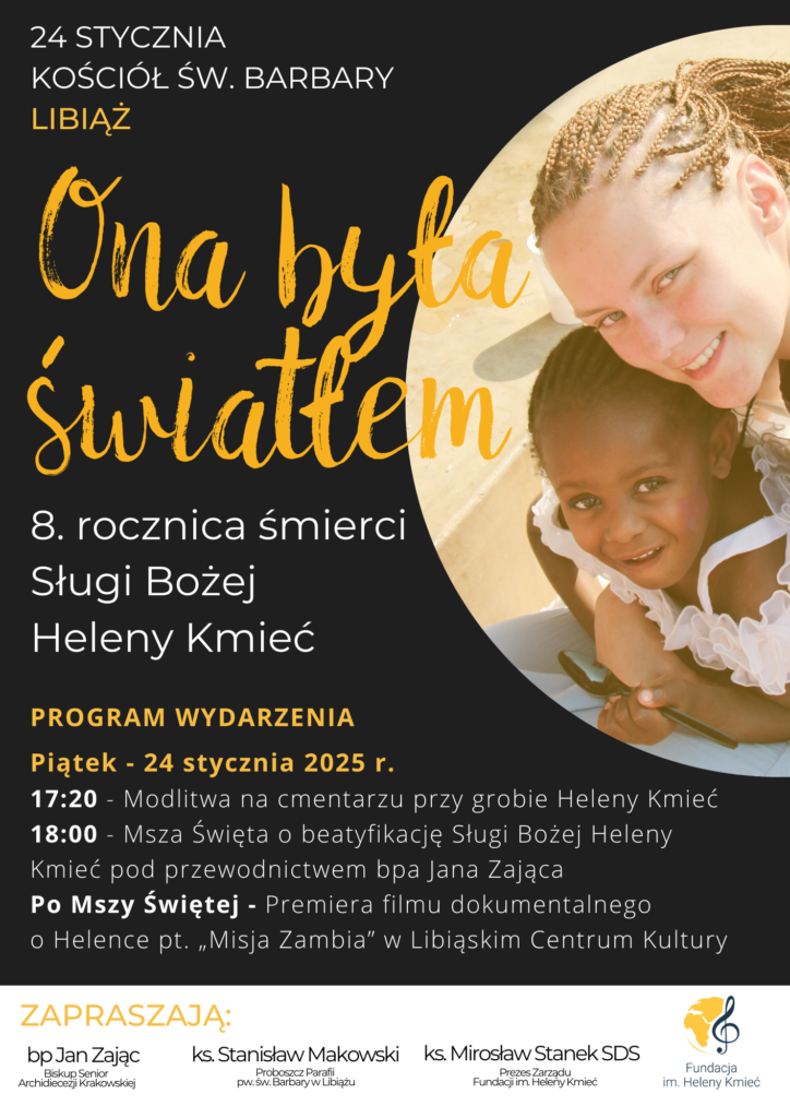 Do udziału w wydarzeniach związanych z 8. rocznicą śmierci Heleny Kmieć w Libiążu zaprasza również Prezes Zarządu Fundacji im. Heleny Kmieć ks. Mirosław Stanek SDS: „Wkrótce będziemy przeżywać kolejną, już ósmą, rocznicę narodzin dla Nieba Sługi Bożej Heleny Kmieć. Chcielibyśmy, aby ten czas stał się okazją do spotkania, wspólnej modlitwy o beatyfikację Heleny oraz poznawania pięknych aspektów jej życia. Dlatego gorąco zapraszamy do nawiedzenia miejsca jej grobu, uczestnictwa we Mszy św. oraz wzięcia udziału w premierze filmu opowiadającego o jej misyjnej pracy w Zambii”.
