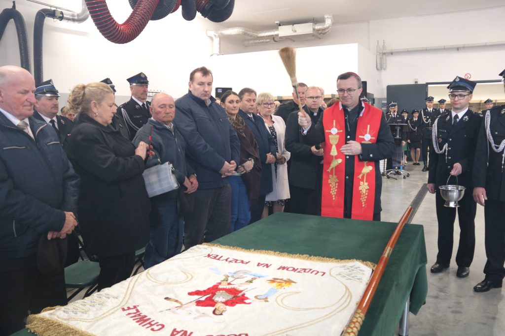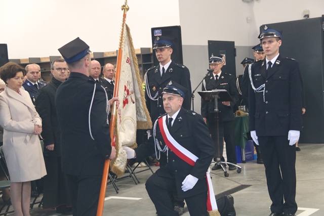 Po Mszy św. bp Bryl poświęcił nowy sztandar OSP w Opatowie, nową strażnicę i wóz pożarniczy.