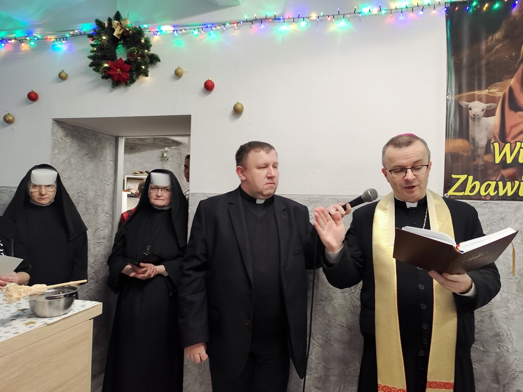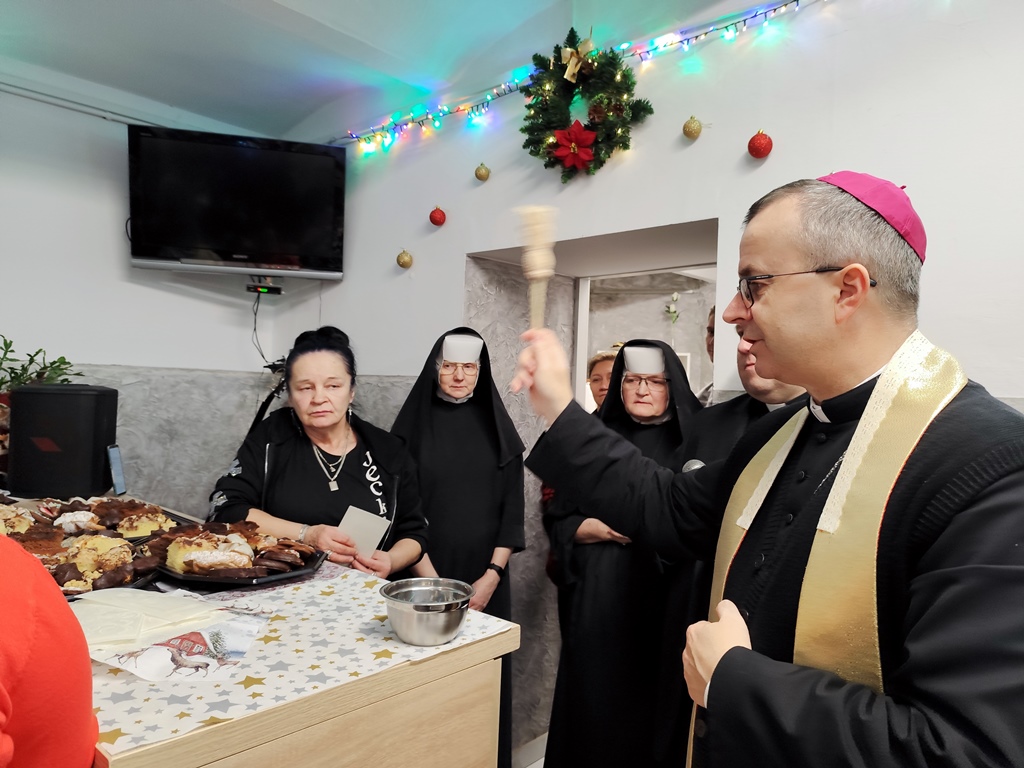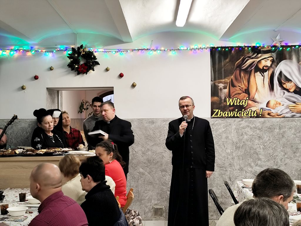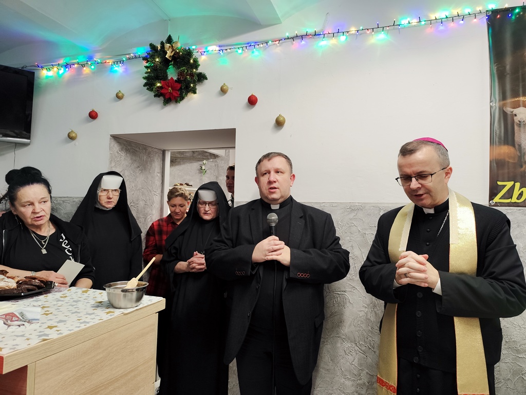 Bp Damian Bryl poświęcił opłatki, którymi potem przełamano się składając sobie życzenia. Był też czas na wspólne kolędowanie. W spotkaniu uczestniczył także ks. kan. Bogumił Kempa, oficjał Sądu Biskupiego w Kaliszu, który jako kapelan posługuje w jadłodajni.