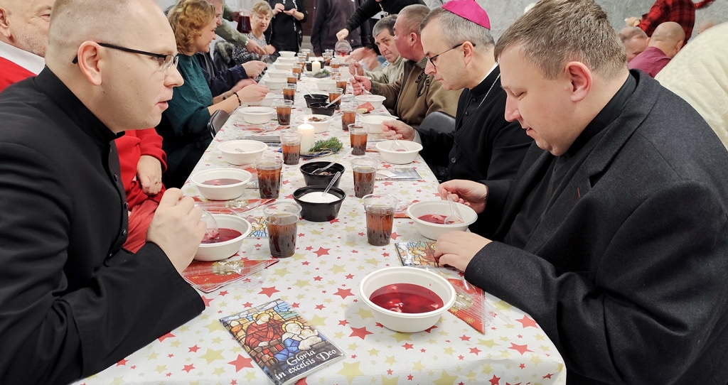 60 osób zasiadło dzisiaj przy wigilijnym stole w jadłodajni w Ostrowie Wielkopolskim prowadzonej przez Fundację „Głodnych nakarmić”, w której posługują siostry albertynki. Z ubogimi wieczerzę spożył bp Damian Bryl.