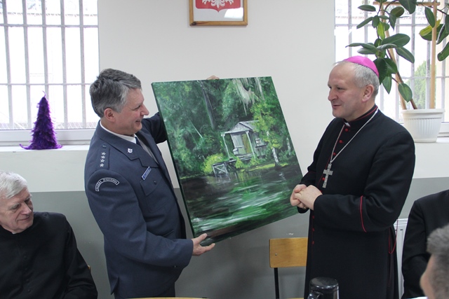 Pracownicy aresztu ofiarowali biskupowi obraz przedstawiający pejzaż wykonany przez jednego z aresztantów.