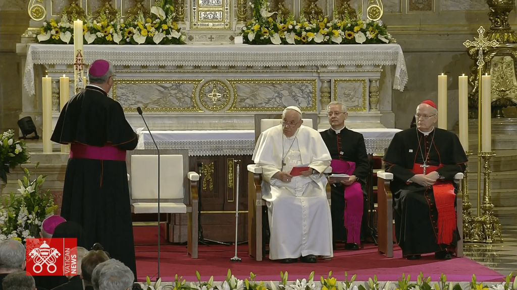 Przy ołtarzu stały relikwie św. Stefana, króla i patrona Węgier. Papieża powitał przewodniczący Konferencji Biskupów Katolickich Węgier, bp András Veres. Wyraził radość i wdzięczność za to, że w ciągu niespełna półtora roku Franciszek ponownie odwiedza Węgry, dodając, iż jest to doświadczenie „bliskości duszpasterskiej” i tej miłości, do której zachęcał on biskupów w czasie tamtej wizyty. Pozdrowił Następcę św. Piotra w imieniu wszystkich zebranych, należących do różnych pokoleń, ale zjednoczonych w wierze w Chrystusa i w pragnieniu służenia Jego Kościołowi z pełnym zaangażowaniem.