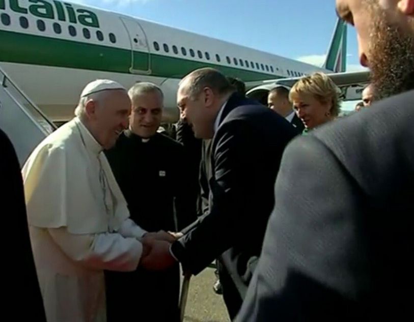 Po wylądowaniu papieskiego samolotu na pokład weszli nuncjusz apostolski w Gruzji, Armenii i Azerbejdżanie, abp Marek Solczyński oraz gruziński szef protokołu. Następnie w drzwiach samolotu ukazał się Franciszek, który przywitał się z prezydentem Giorgim Margwelaszwilim z małżonką. Ze zwierzchnikiem Gruzińskiego Kościoła Prawosławnego, patriarchą-katolikosem Eliaszem II Ojciec Święty wymienił uścisk dłoni. Dwójka dzieci w tradycyjnych strojach ofiarowała papieżowi kosz winogron.