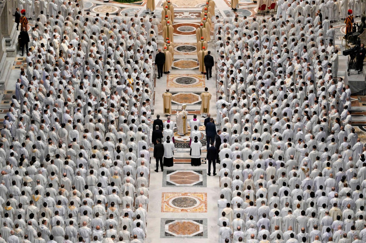 Pierwszą Mszę św. Krzyżma jako biskup Rzymu Leon XIV koncelebrował wraz z członkami kolegium kardynalskiego, biskupami oraz duchowieństwem Wiecznego Miasta oraz księżmi, którzy przebyli jako pielgrzymi. Kapłani odnowili przyrzeczenia składane w dniu swoich święceń.