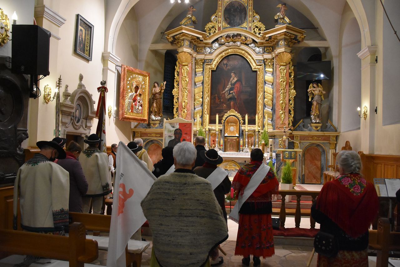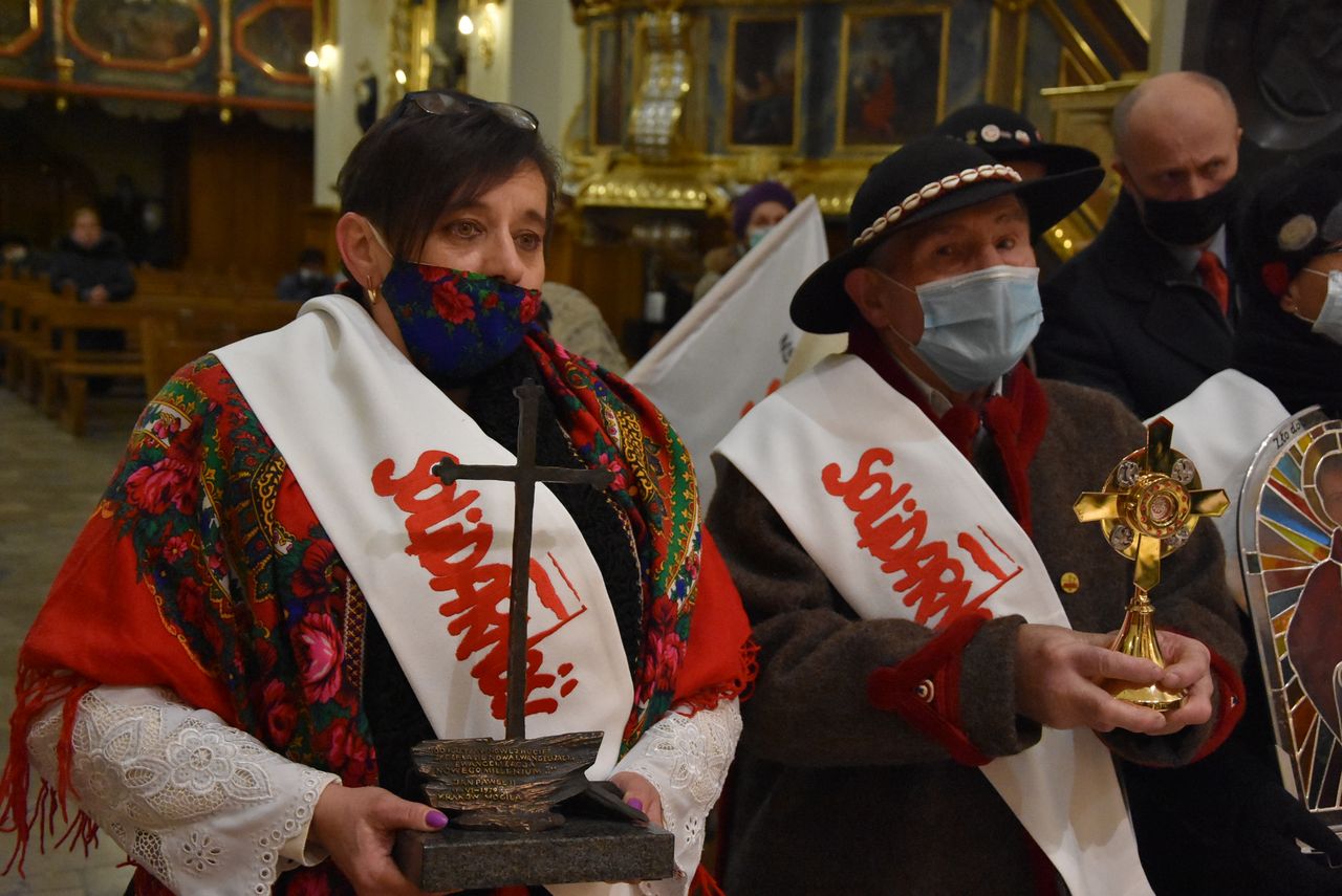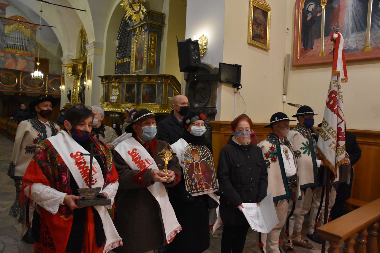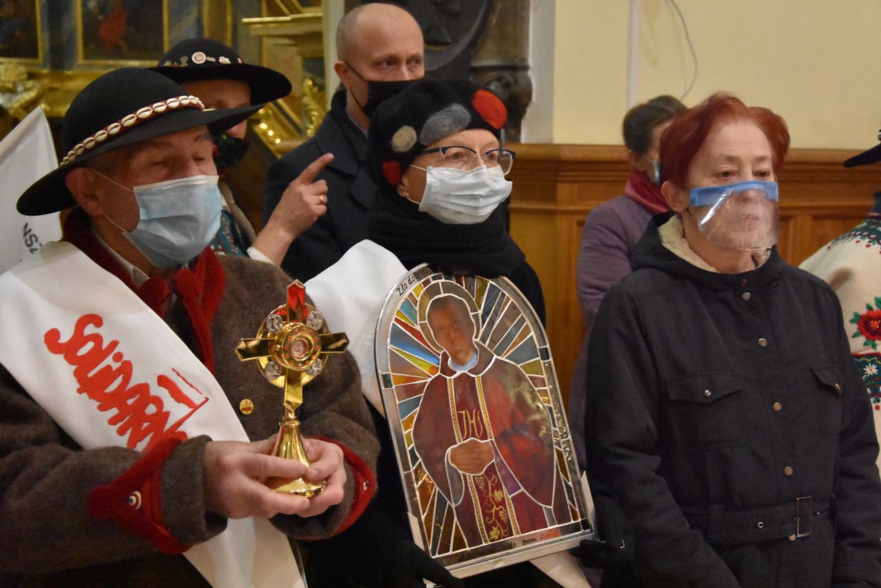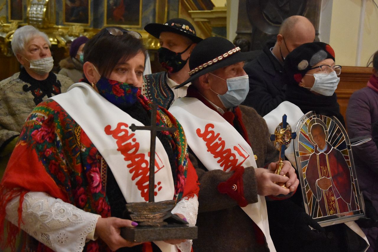Obraz Matki Bożej Solidarności i relikwie bł. ks. Jerzego Popiełuszki do świątyni św. Katarzyny przynieśli z siedziby nowotarskiej „Solidarności” członkowie tego związku i członkowie Związku Podhalan. Wszyscy ubrani byli w stroje regionalne, nieśli też poczet sztandarowy „Solidarności”.