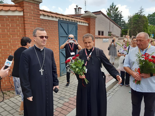 Fot. Ewa Kotowska-Rasiak/KAITrzech księży 19. Wielkopolskiej Pieszej Pielgrzymki „Od Miłosierdzia do Miłosierdzia” dotarło do Sanktuarium Miłosierdzia Bożego w Łagiewnikach. Utrudzonych kapłanów powitali biskup kaliski Damian Bryl i pielgrzymi, którzy w tym roku łączyli się duchowo.