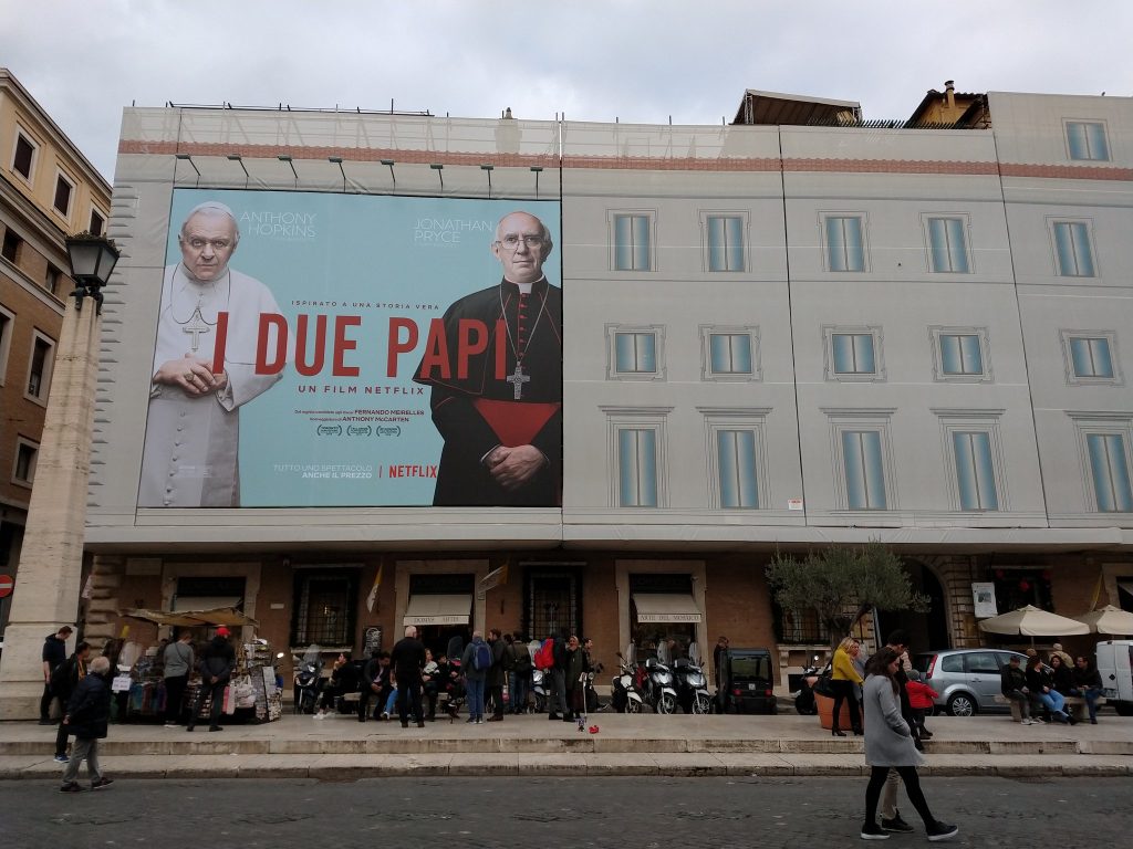Fot. TwitterW bezpośrednim sąsiedztwie Watykanu wielkich rozmiarów plakat reklamuje film „Dwóch papieży”. Trzymetrowej wysokości reklamę filmu „Dwóch papieży” brazylijskiego reżysera Fernando Meirelles`a przedstawiającą głównych bohaterów: Benedykta XVI (w tej roli Anthony Hopkins) oraz Jorge Mario Bergoglio, późniejszego papieża Franciszka (Jonathan Pryce), umieszczono na jednym z budynków na Via Della Conciliazione niedaleko placu św. Piotra. Obok ma swoją siedzibę Sala Stampa, biuro prasowe Stolicy Apostolskiej, w tym samym budynku znajdują się mieszkania kilku kardynałów.