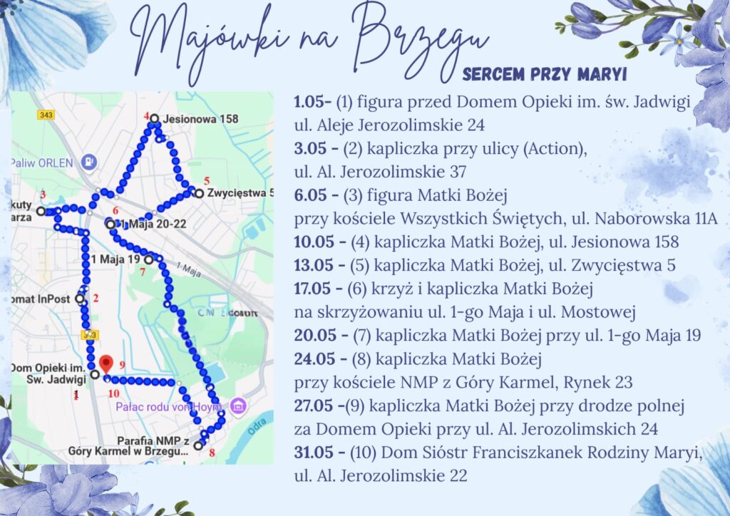 Pod kapliczki przychodzi do stu osób. Śpiewają Litanię Loretańską przy akompaniamencie akordeonu i słuchają rozważań św. Zygmunta Szczęsnego Felińskiego. – Główną intencją inicjatywy „Majówki na Brzegu – sercem przy Maryi” jest pomyślność miasta i ojczyzny. Myślę, że pomysł się udał. Fatycznie przychodzą mieszkańcy z wszystkich trzech parafii. Opowiadają historię tych kapliczek i zawiązuje się niepisana wspólnota wiary. Nawet ktoś znalazł jeszcze jedną kapliczkę w Brzegu – dodaje siostra zakonna i nauczycielka religii w brzeskiej szkole.