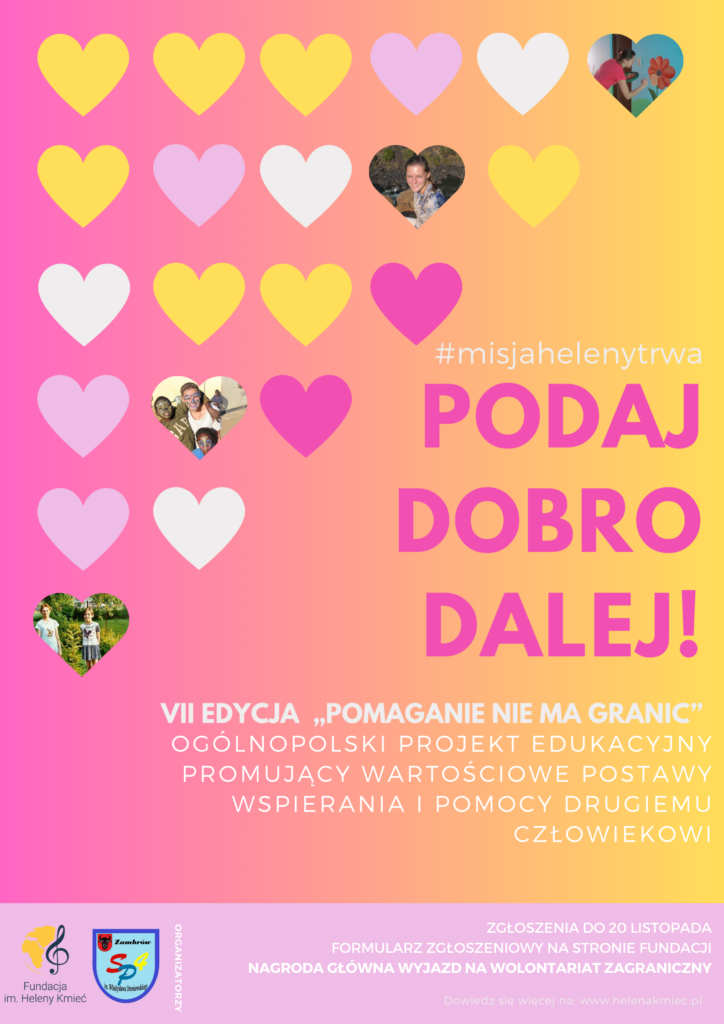 Materiały prasoweFundacja im. Heleny Kmieć zachęca do udziału w VII edycji ogólnopolskiego projektu edukacyjnego „Podaj dobro dalej!”. Celem projektu jest edukacja, uwrażliwianie i zachęta do niesienia pomocy drugiemu człowiekowi przez dzieci i młodzież, stawiając za przykład Sługę Bożą Helenę Kmieć. Temat tegorocznej edycji konkursu to “Pomaganie bez granic”. Zgłoszenia do konkursu, który upamiętnia zamordowaną w Boliwii wolontariuszkę misyjną trwają do 20 listopada.