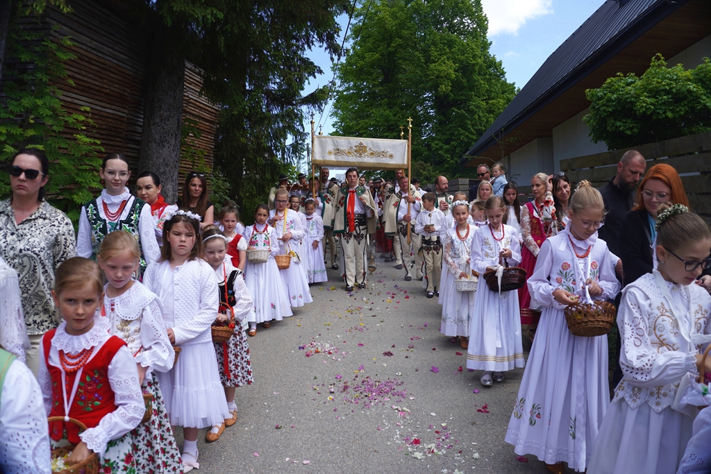 Na procesji górale i góralki nieśli chorągwie, feretrony z różnymi świętymi, m.in. św. Janem Pawłem II. Z kolei baldachim, pod którym ks. proboszcz Janusz Rzepa na przemian z ks. wikarym Arturem Kulakiem nieśli monstrancję z Najświętszym Sakramentem, trzymali dorośli górale w strojach regionalnych i motocykliści z grupy „Pasja i Wiara” z Miętustwa.