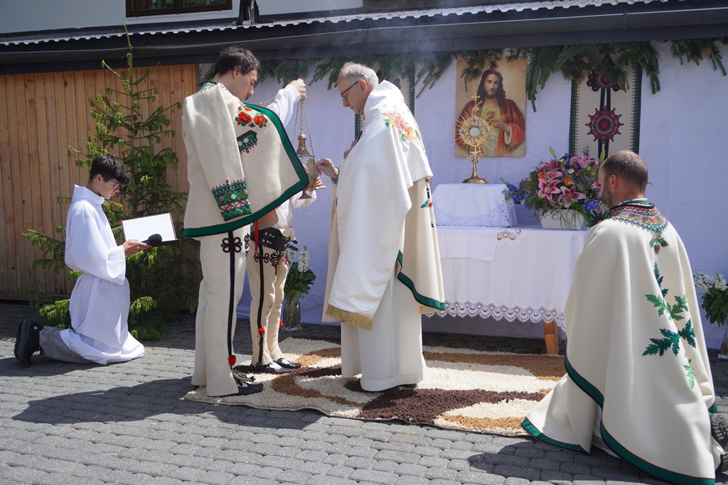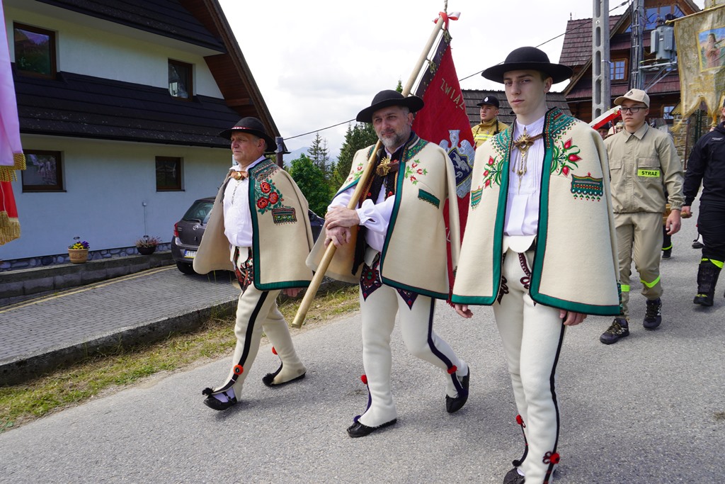 Na procesji górale i góralki nieśli chorągwie, feretrony z różnymi świętymi, m.in. św. Janem Pawłem II. Z kolei baldachim, pod którym ks. proboszcz Janusz Rzepa na przemian z ks. wikarym Arturem Kulakiem nieśli monstrancję z Najświętszym Sakramentem, trzymali dorośli górale w strojach regionalnych i motocykliści z grupy „Pasja i Wiara” z Miętustwa.