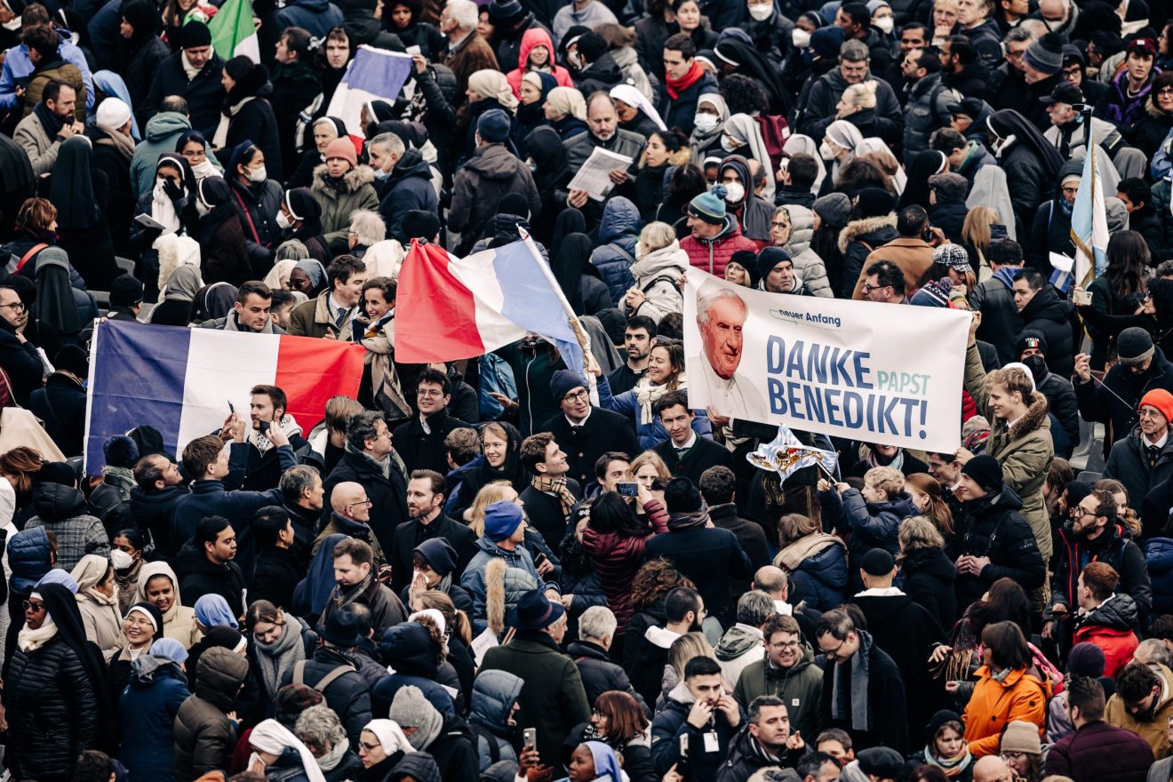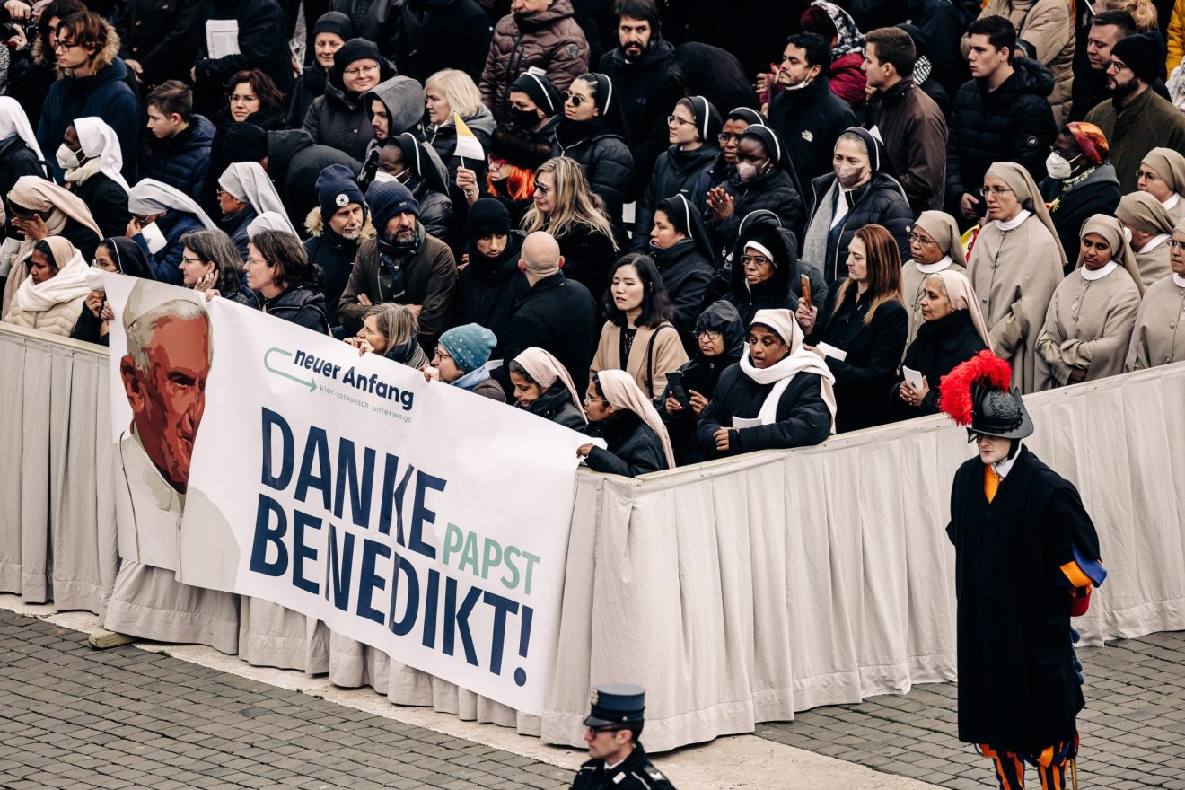 W tłumie zgromadzonych ktoś wzniósł okrzyki: „Santo subito”, co nagrodzono oklaskami. Pojawił się także transparent z takim napisem, jak i transparenty w języku niemieckim: „Benedykcie XVI dziękujemy”. Po śpiewie „Magnificat” trumnę procesjonalnie wniesiono bo bazyliki. Benedykta XVI żegnały oklaski i okrzyki „Benedetto”. Kondukt zatrzymał się przy papieżu Franciszku, który pobłogosławił trumnę z ciałem swego poprzednika, dotknął jej i skłonił przed nią głowę.