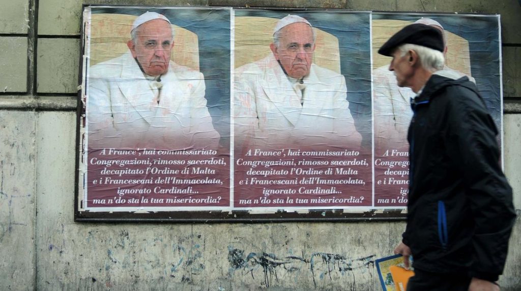 Tekst zamieszczony na plakacie odpowiada krytycznym wobec Franciszka konserwatywnym kręgom kościelnym, które nie zgadzają się z przeprowadzaną przez niego reformę Kurii Rzymskiej, doprowadzeniem do dymisji Wielkiego Mistrza Zakonu Kawalerów Maltańskich, Matthew Festinga i wprowadzenia zarządu komisarycznego w pogrążonym w kryzysie włoskim zakonie franciszkanów Niepokalanej.