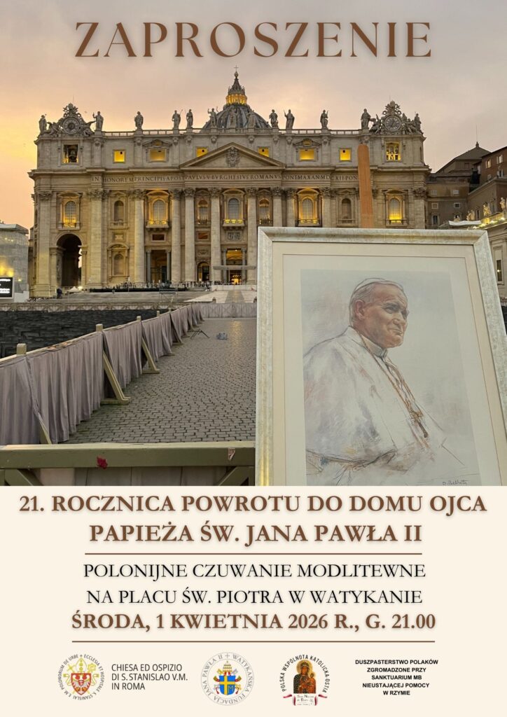 2 kwietnia przypada 21. rocznica odejścia do Domu Ojca Papieża Polaka. W tym roku, ze względu na przypadający tego dnia Wielki Czwartek i rozpoczynające się obchody Triduum Paschalnego, Polonijne Czuwanie Modlitewne odbędzie się wyjątkowo w środę, 1 kwietnia. Wspólna modlitwa rozpocznie się o godz. 21.00 na Placu św. Piotra w Watykanie.
