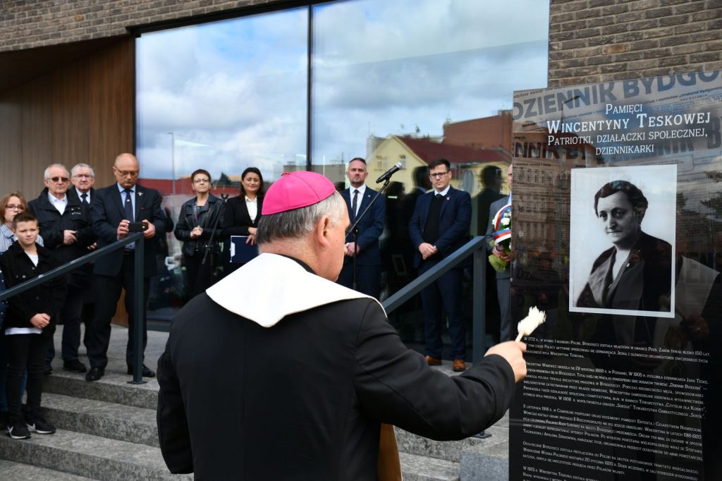 Fot. Marcin Jarzembowski„Podziwiamy jej osobowość, talent, odwagę, zaangażowania w życie społeczne i polityczne” – powiedział bp Krzysztof Włodarczyk, który poświęcił przed siedzibą Delegatury Instytutu Pamięci Narodowej w Bydgoszczy tablicę upamiętniającą Wincentynę Teskową.