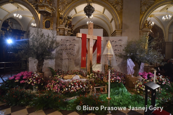 Sześciometrowa specjalnie uszyta czerwona stuła, ogromny krzyż, drzewa oliwne jako znak łączności z Ziemią Zbawiciela, ale i symbol pokoju oraz tysiące goździków to m.in. tegoroczna dekoracja Grobu Bożego na Jasnej Górze. Znajduje się on jak zwykle w Kaplicy Matki Bożej, ale podobnie jak rok temu z boku ołtarza i po raz pierwszy od dawna nie będzie rozebrany od razu po procesji rezurekcyjnej, a przez tydzień pozostanie jeszcze na swoim miejscu.