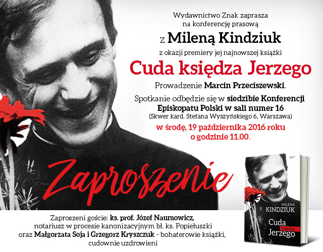 Wydawnictwo Znak zaprasza 19 października na konferencję prasową z Mileną Kindziuk z okazji premiery jej najnowszej książki „Cuda księdza Jerzego”. Spotkanie poprowadzi Marcin Przeciszewski, prezes Katolickiej Agencji Informacyjnej.