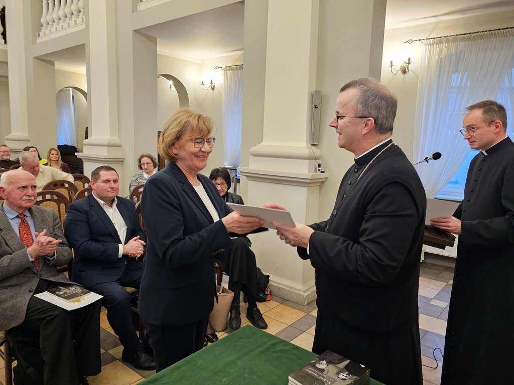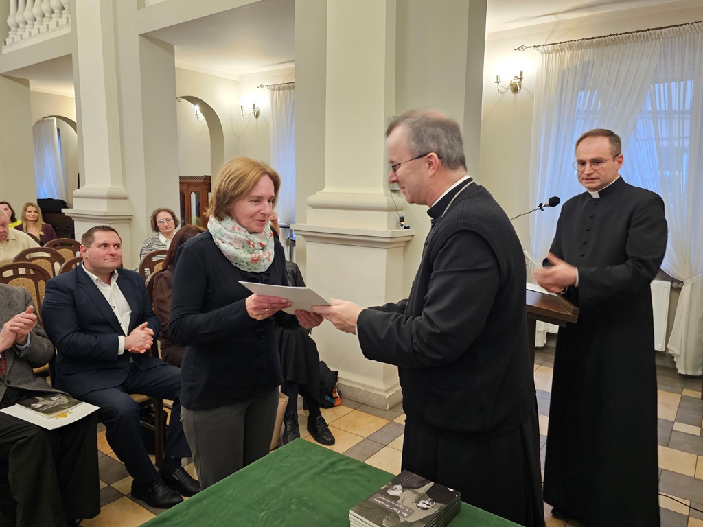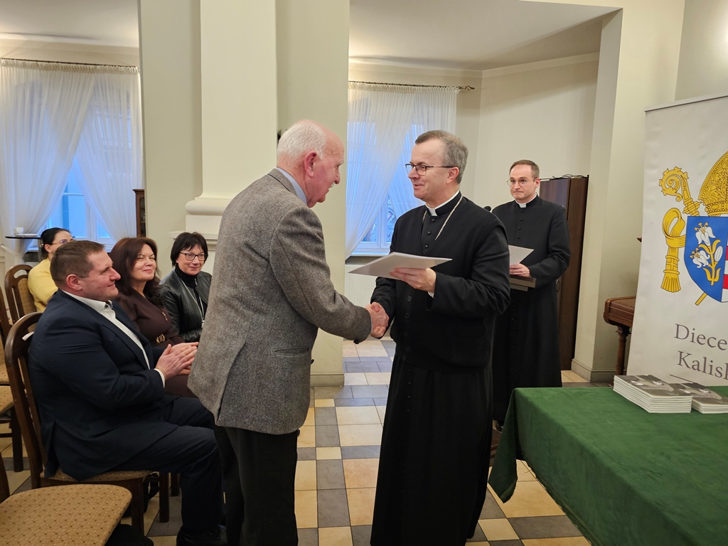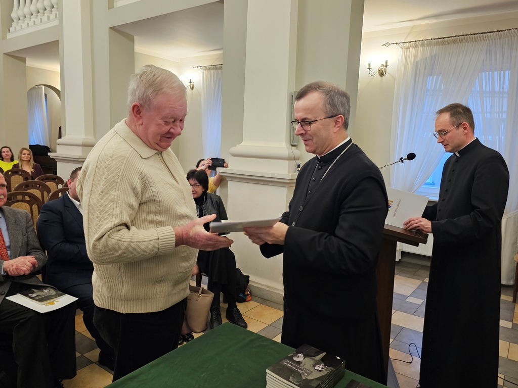 Podczas spotkania biskup kaliski Damian Bryl wręczył egzemplarz książki i podziękowanie osobom, których wspomnienia o ks. Sieradzanie znalazły się w publikacji.