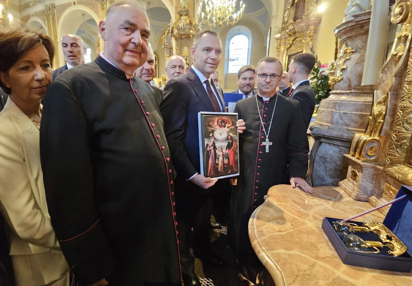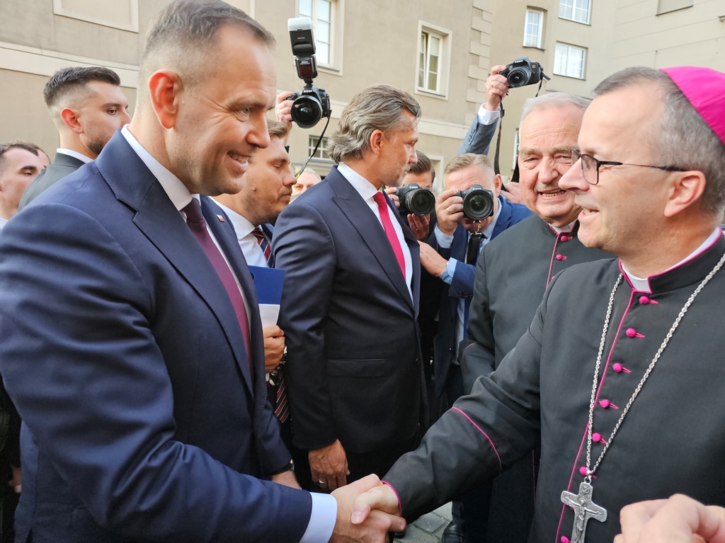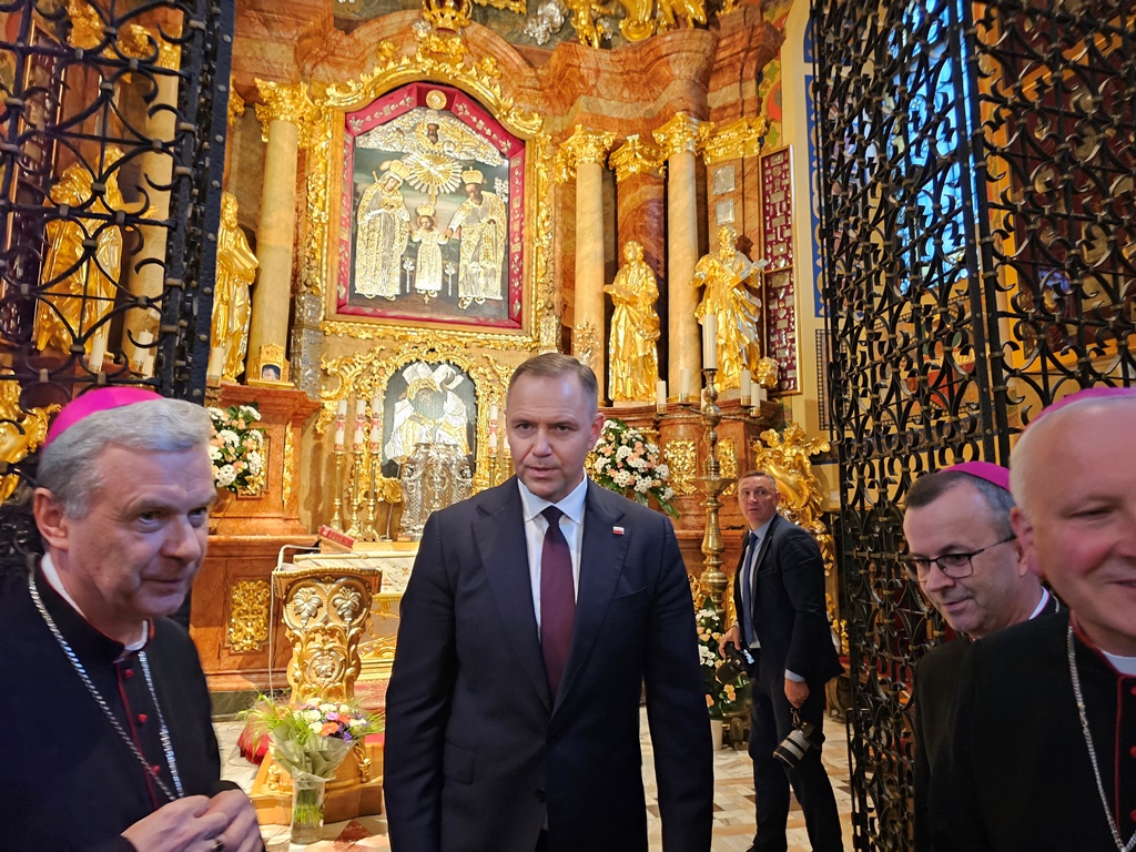 Przed kaliską bazyliką głowę państwa powitali: biskup kaliski Damian Bryl, biskup pomocniczy diecezji kaliskiej Łukasz Buzun, biskup pomocniczy diecezji łomżyńskiej Tadeusz Bronakowski i ks. prał. Jacek Plota, kustosz Narodowego Sanktuarium św. Józefa w Kaliszu.