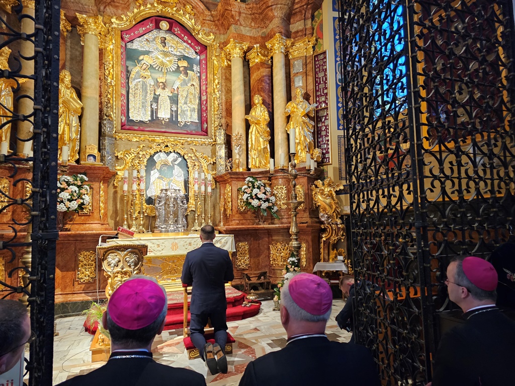 Fot. Ewa Kotowska-Rasiak/KAIPrezydent Polski dr Karol Nawrocki podczas wizyty w Kaliszu odwiedził Narodowe Sanktuarium św. Józefa, gdzie modlił się przed cudownym wizerunkiem. Głowie państwa towarzyszył biskup kaliski Damian Bryl.