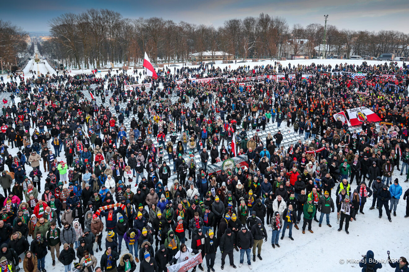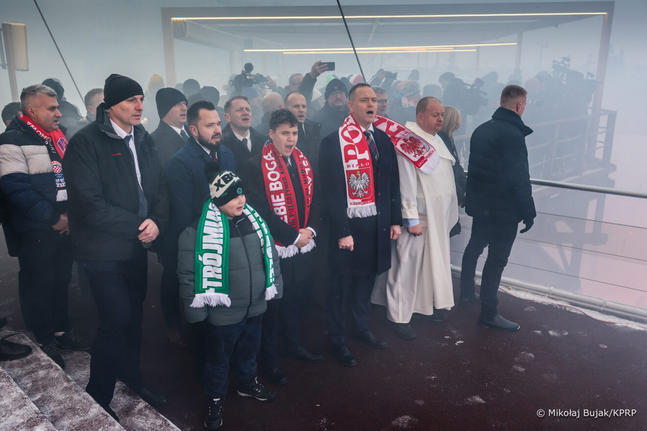 Dziękował kibicom za odwagę, wytrwałość. – W zeszłym roku przyjęliście mnie jako kandydata na urząd Prezydenta Rzeczpospolitej, także dzięki waszej odwadze i temu, że stadionów nie dotknęła propaganda i chwilowe ideologiczne mody. Także dlatego zostałem prezydentem i za to wam dziękuję. Udało nam się obronić to hasło, które przywołujemy „Bóg, honor i ojczyzna”. Chcemy, aby Polska była normalna. Aby Polska była silna. Aby Polska była bezpieczna. Aby bezpieczne były nasze granice. Aby była państwem dobrobytu, bez nielegalnych imigrantów. To udało nam się wspólnie wygrać 1 czerwca także dzięki waszej odwadze – mówił Nawrocki.