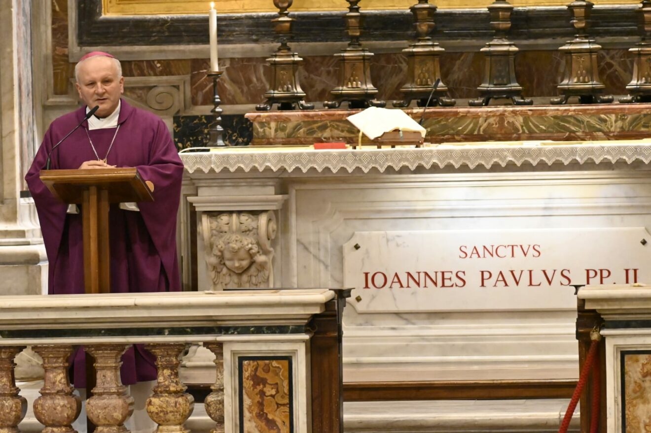 Jesteśmy tutaj przy ołtarzu św. Jana Pawła II, który uczył o wielkości i godności człowieka, nie tylko naturalnej, ale też mówił o wielkości człowieka w tym wymiarze wiary, odniesienia do Pana Boga, wymiarze nadprzyrodzonym – powiedział biskup pomocniczy diecezji kaliskiej Łukasz Buzun podczas Mszy św. przy grobie św. Jana Pawła II w watykańskiej Bazylice św. Piotra. Eucharystii przewodniczył przewodniczący Konferencji Episkopatu Polski abp Tadeusz Wojda.