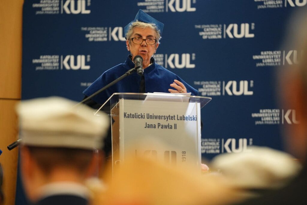 „Nie uratujemy świata chrześcijańskiego, albowiem nie mamy już w sobie pragnienia podboju i zrozumieliśmy zło dominacji. Będziemy jednak kontynuować historię chrześcijaństwa w ten oto sposób – w filozofii, zastępując dogmatykę fenomenologią; w duszpasterstwie, zastępując dogmatykę świadectwem” – zachęciła prof. Chantal Delsol w wykładzie pt. „Misja i osoba świadka”.  Wybitna francuska filozofka otrzymała dzisiaj w Lublinie doktorat honoris causa Katolickiego Uniwersytetu Lubelskiego Jana Pawła II.
